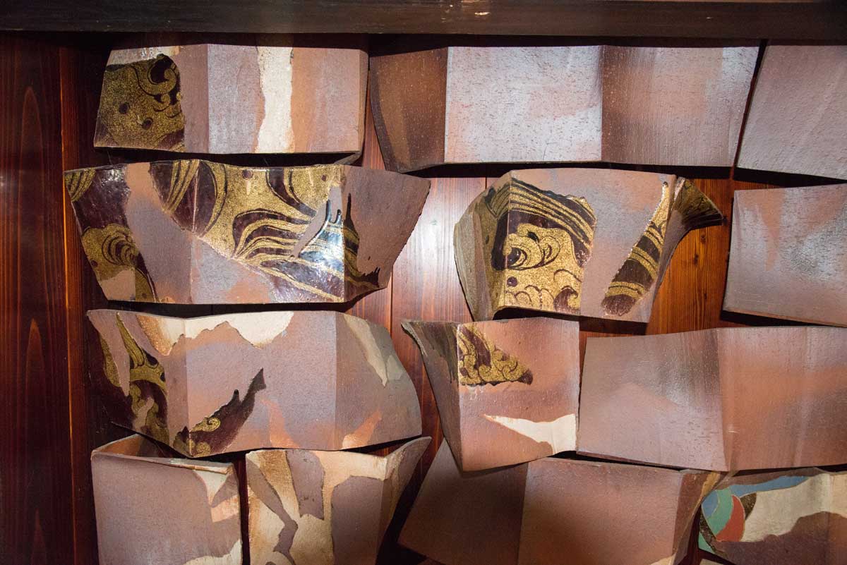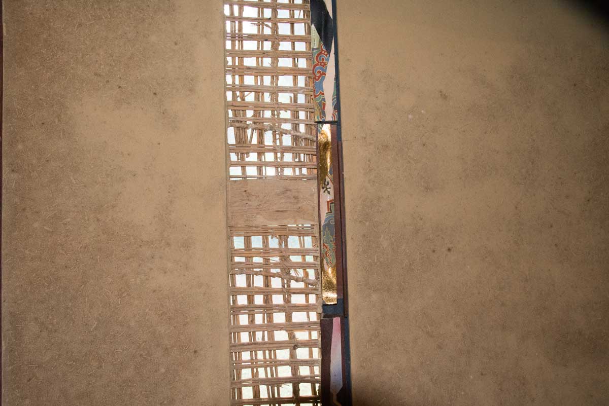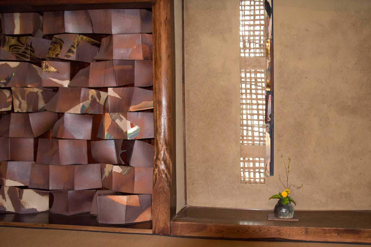 | 床の間にやきもの(九谷焼) | 土壁の小舞(壁下地の竹)横にやきもの |