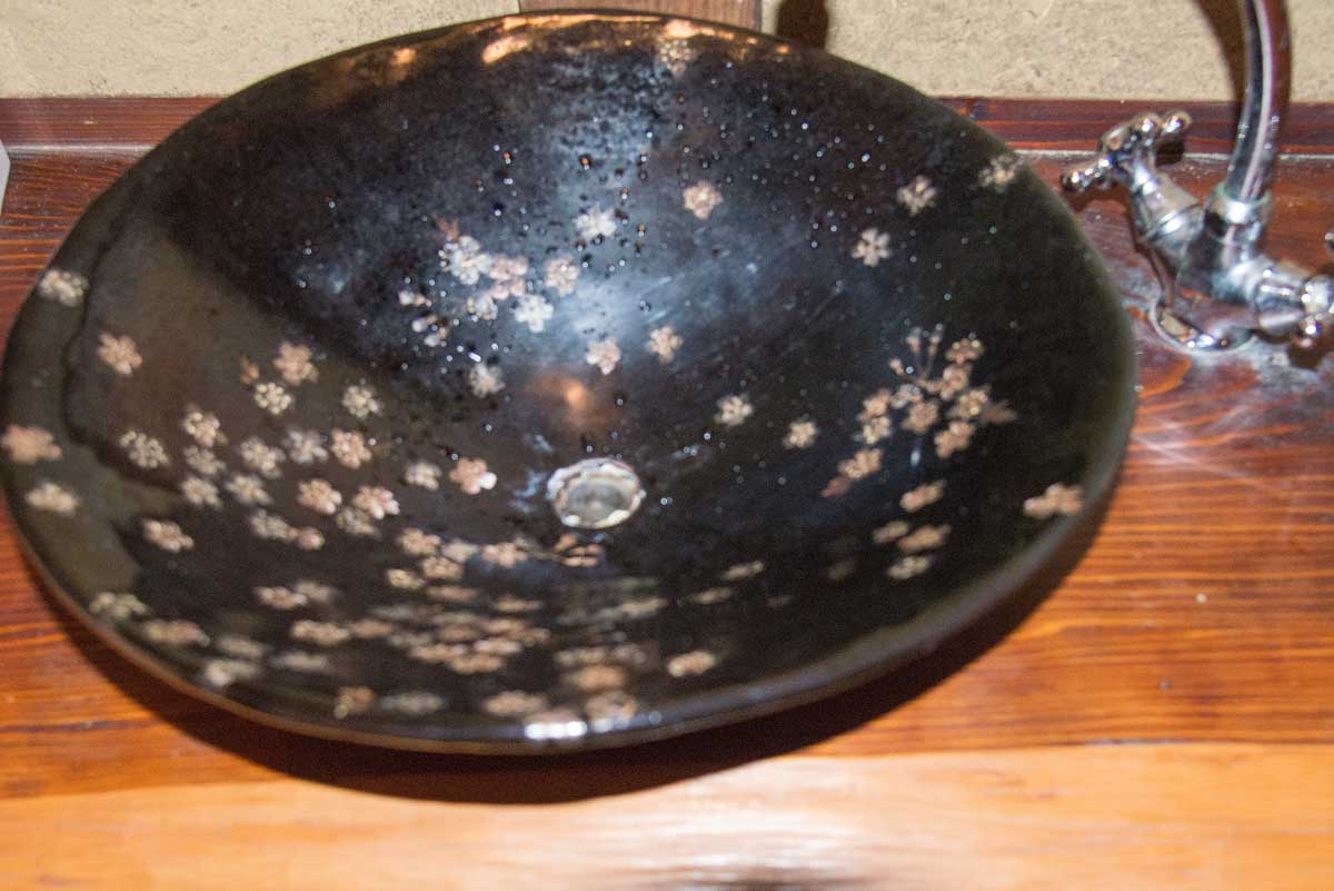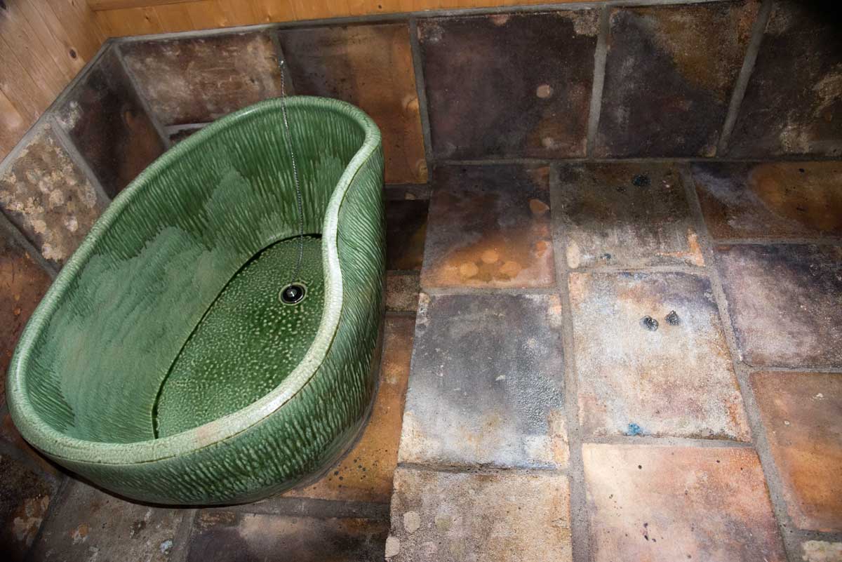 | 洗面台T124 吉川水城 | 風呂T121 澤 清嗣 床や壁の陶板は 登り窯の棚板として使われていたもの |