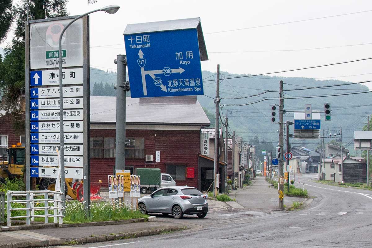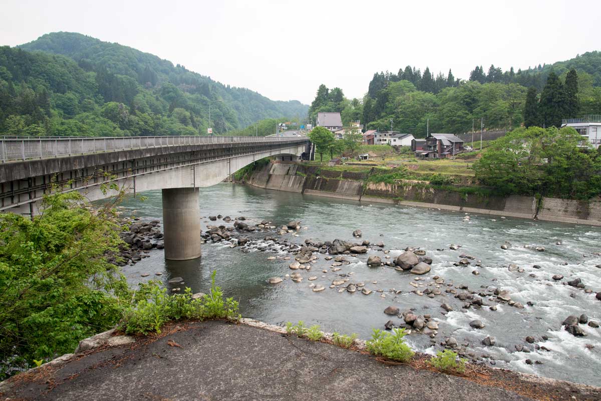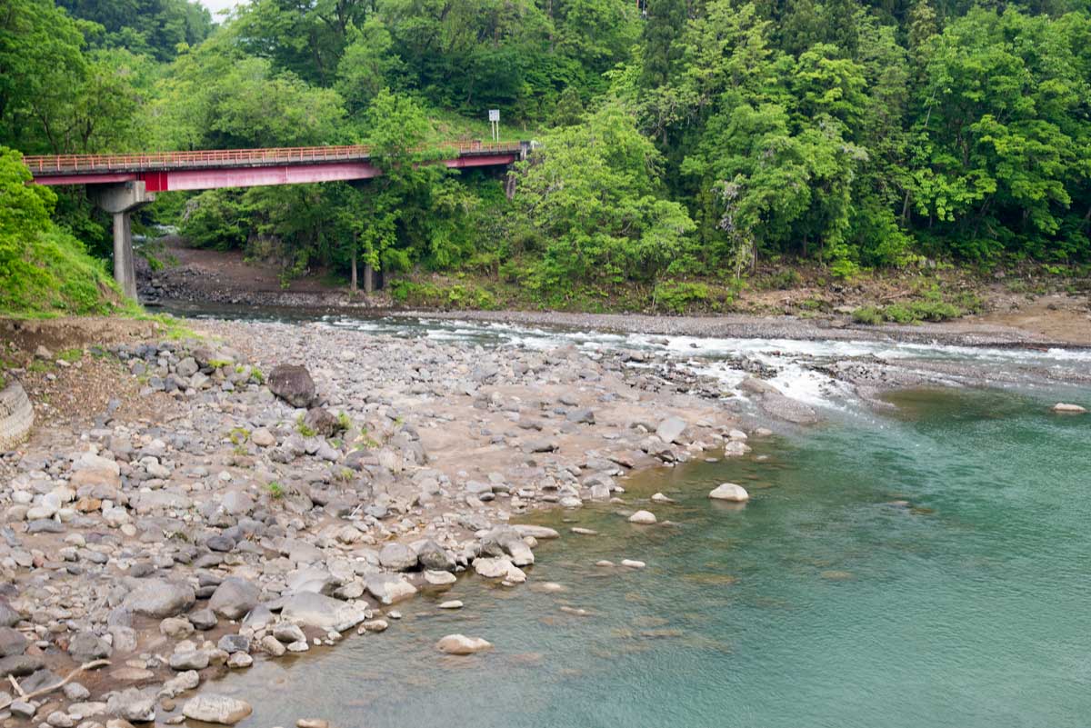 橋を渡った所から長野県栄村を望む中津川に架かる中津橋