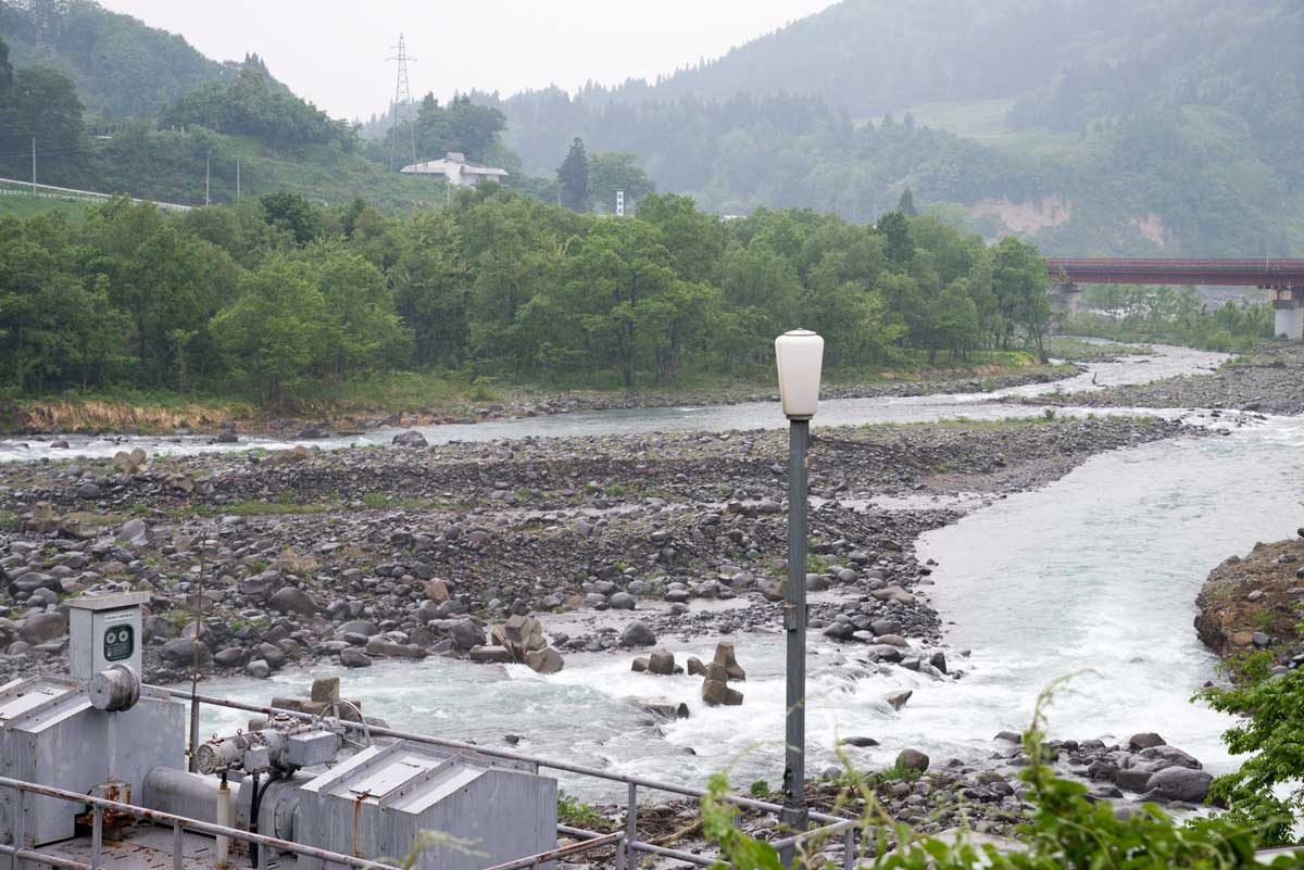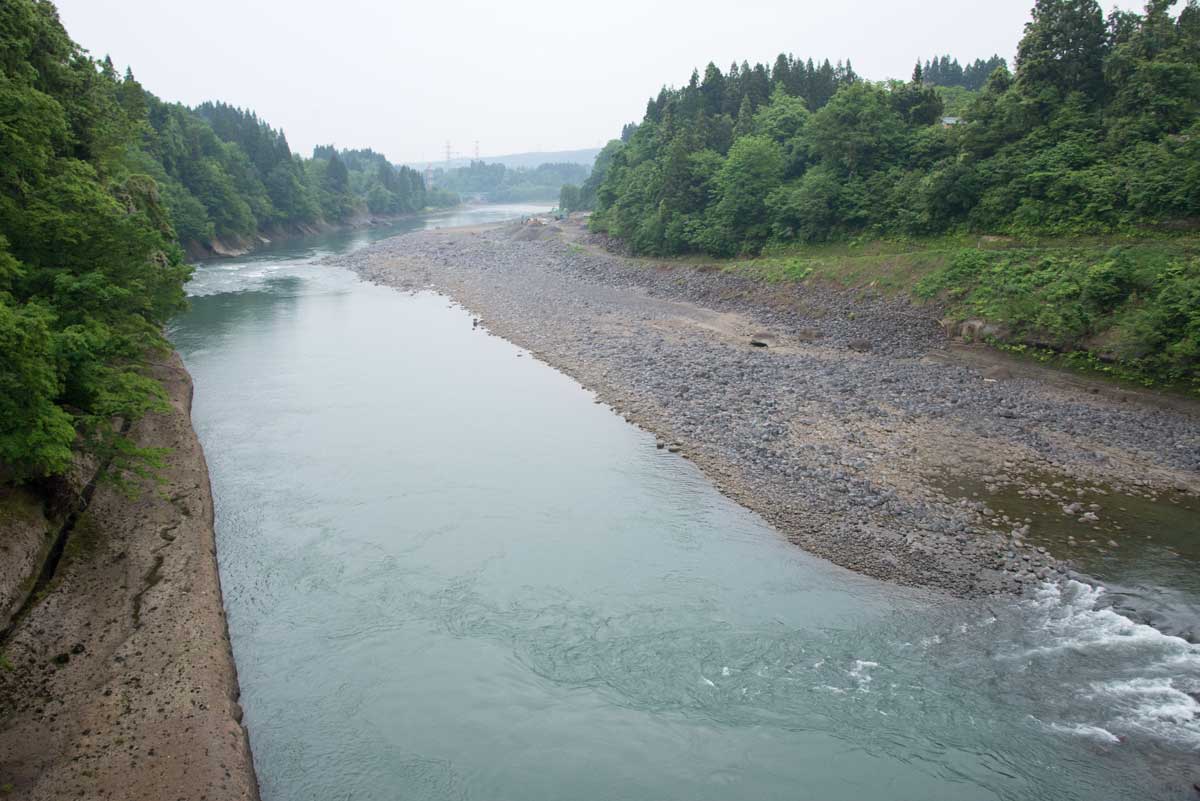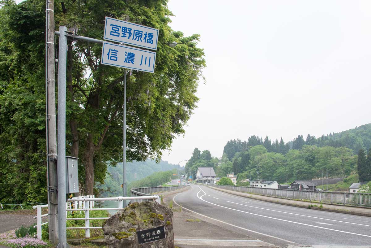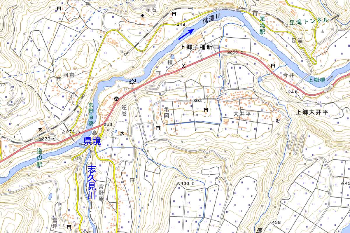 国道117号にある道の駅・信越さかえの先で宮野原橋を渡ると千曲川から信濃川にかわる。この県境で支流・志久見川が合流する。