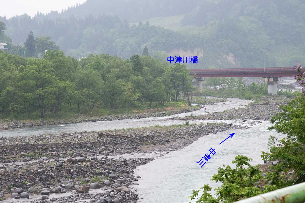 中津川は秋山郷の和山温泉と切明温泉を経由し、さらに遡って野反湖を源流にしている。途中で雑魚川と魚野川と合流するが、どちらの支流も長く、志賀高原の東の分水嶺にまで達している。