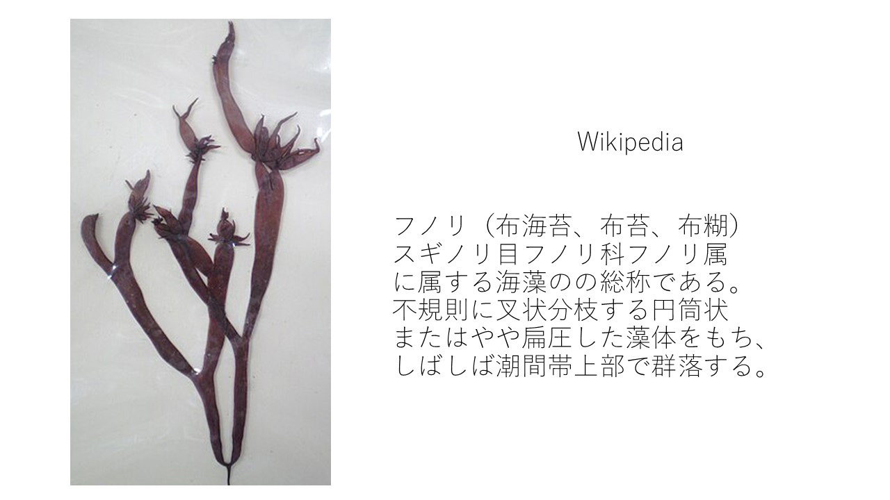 | 重箱風のへぎに盛り付け | フノリとその説明:ワカメや昆布等の海藻類 とは育つ場所が異なり、海の干満線間岩礁に 生育する、干潮時は光合成ができる |