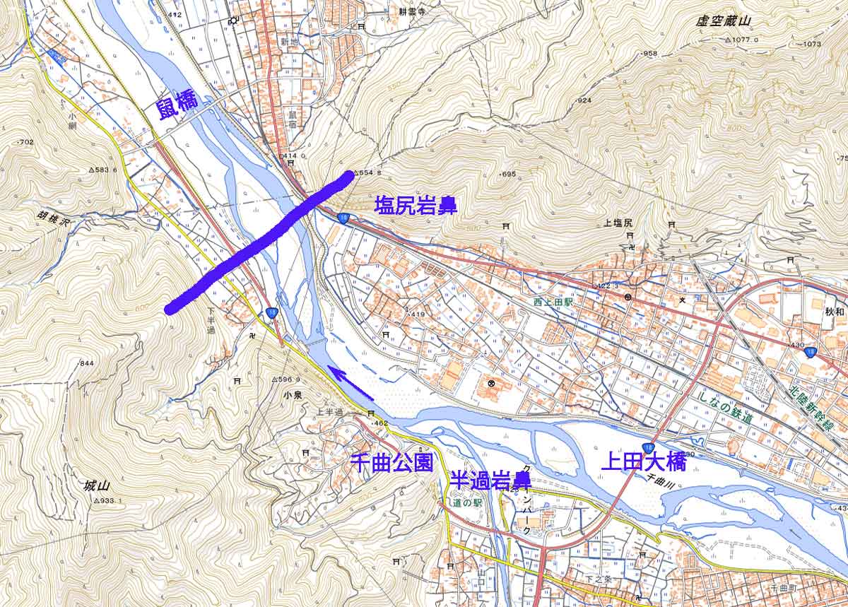 試みに、半過岩鼻の後方の送電塔の標高650mと対岸の塩尻岩鼻の尾根の標高650mの