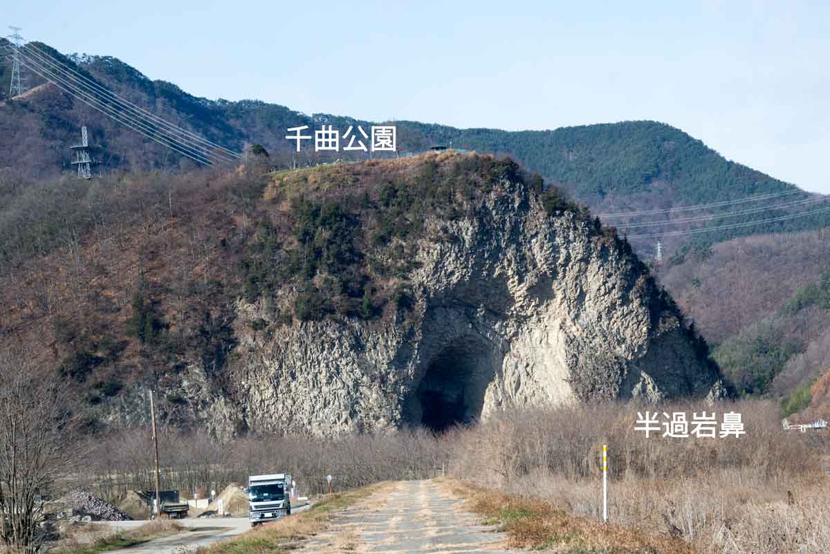 千曲公園の下にある千曲川に向かっての絶壁を半過岩鼻はんがいわばなと呼ぶ。