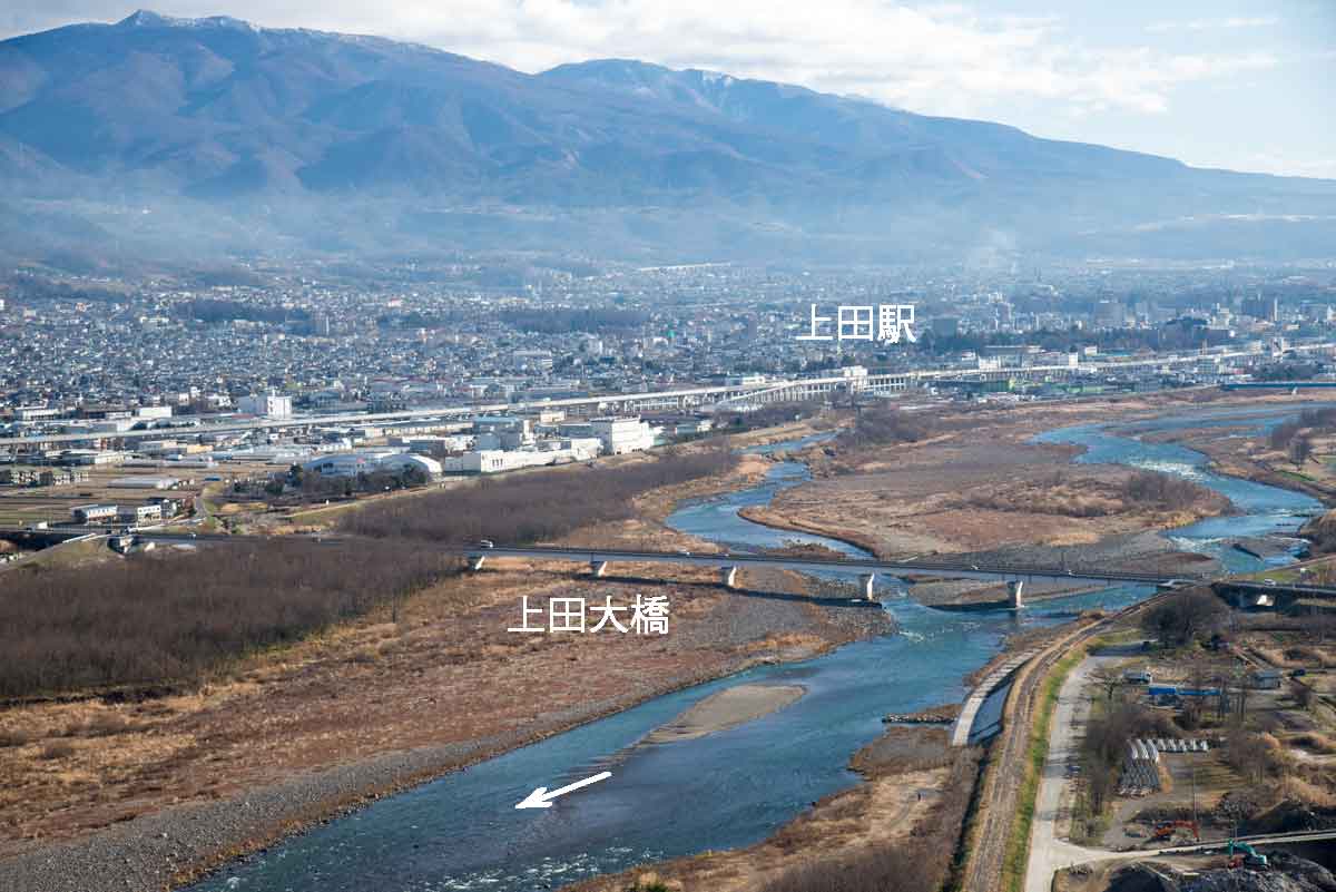 橋は上田大橋 後方に上田駅と北陸新幹線が見える