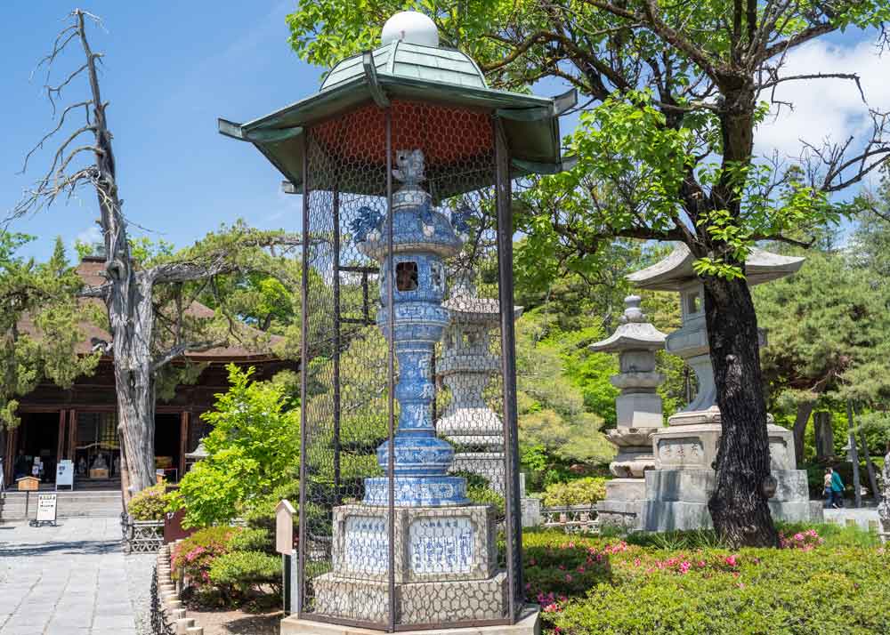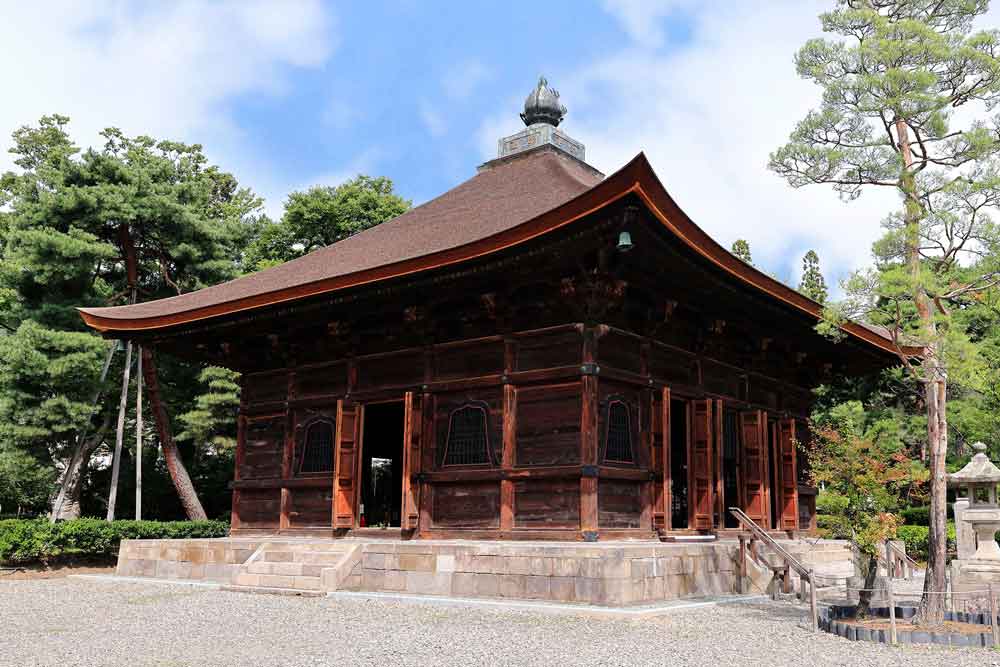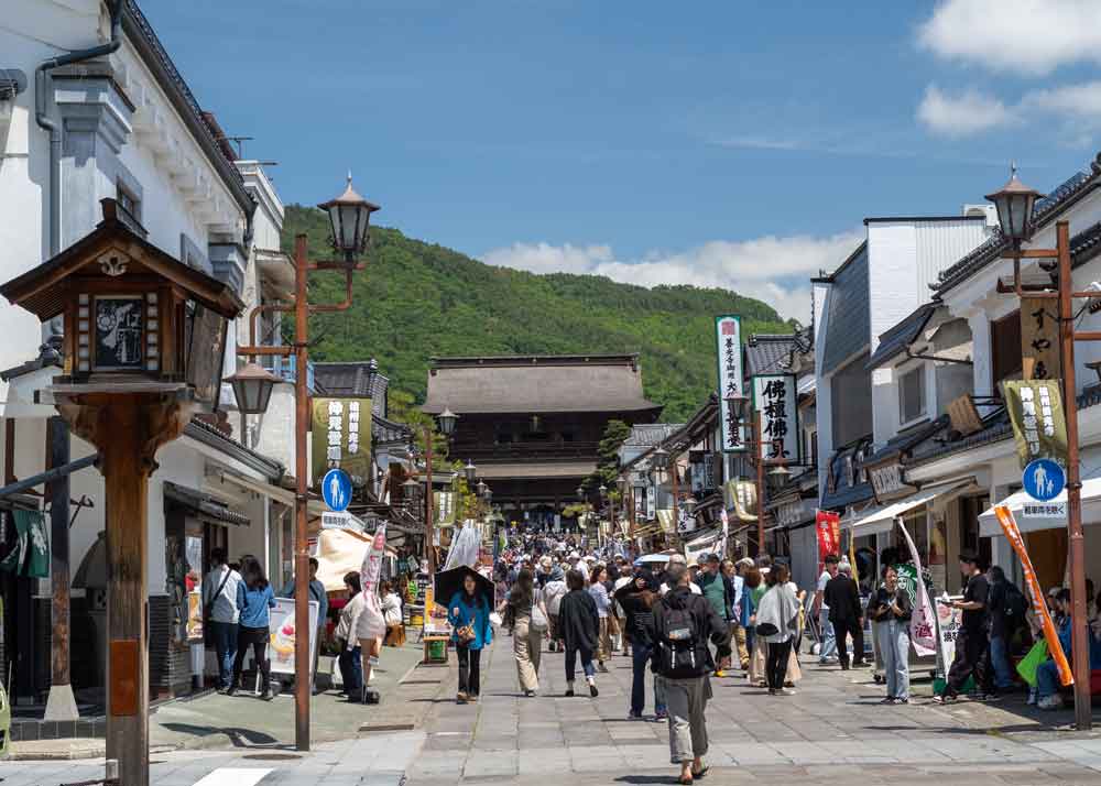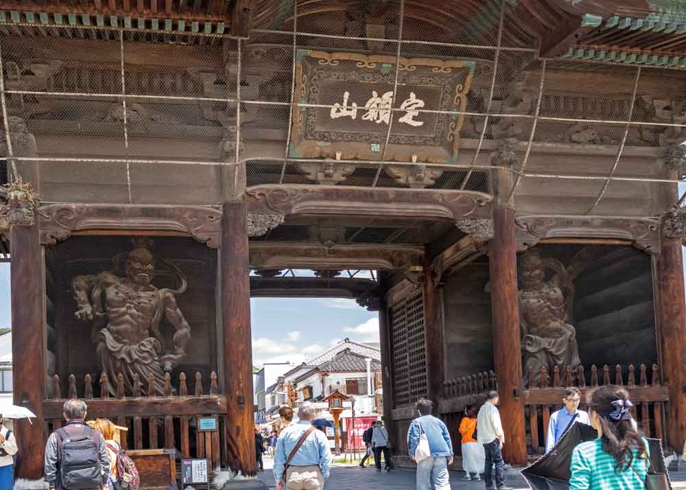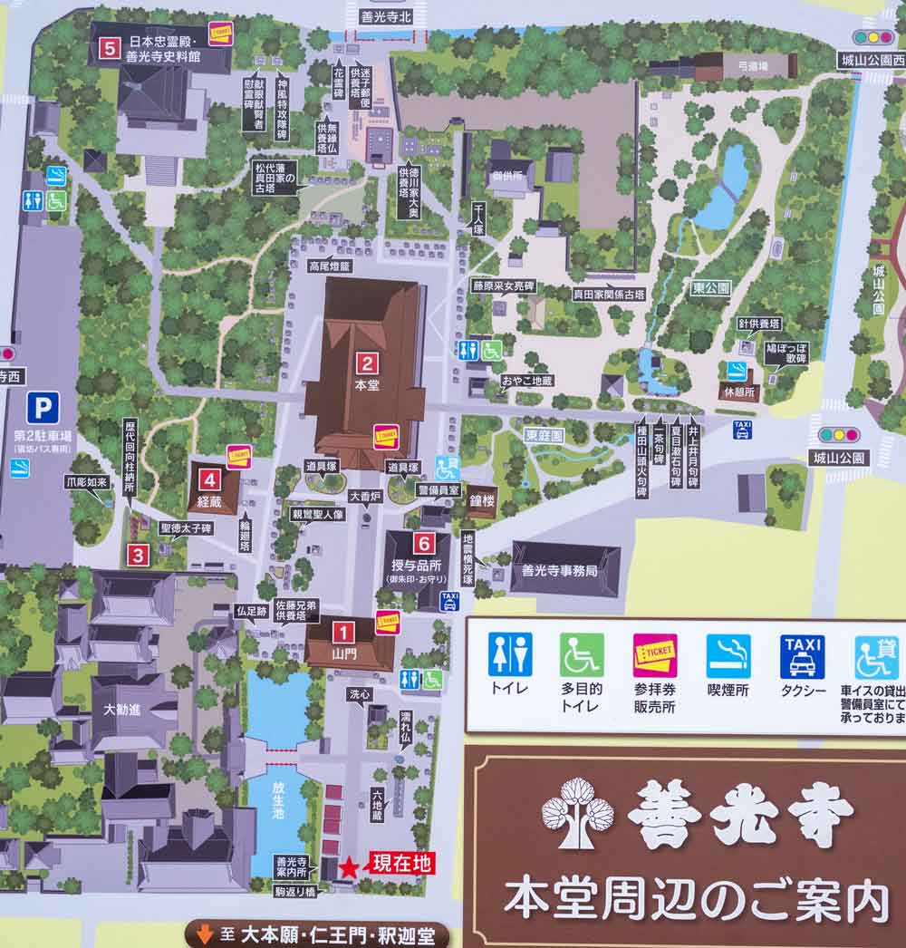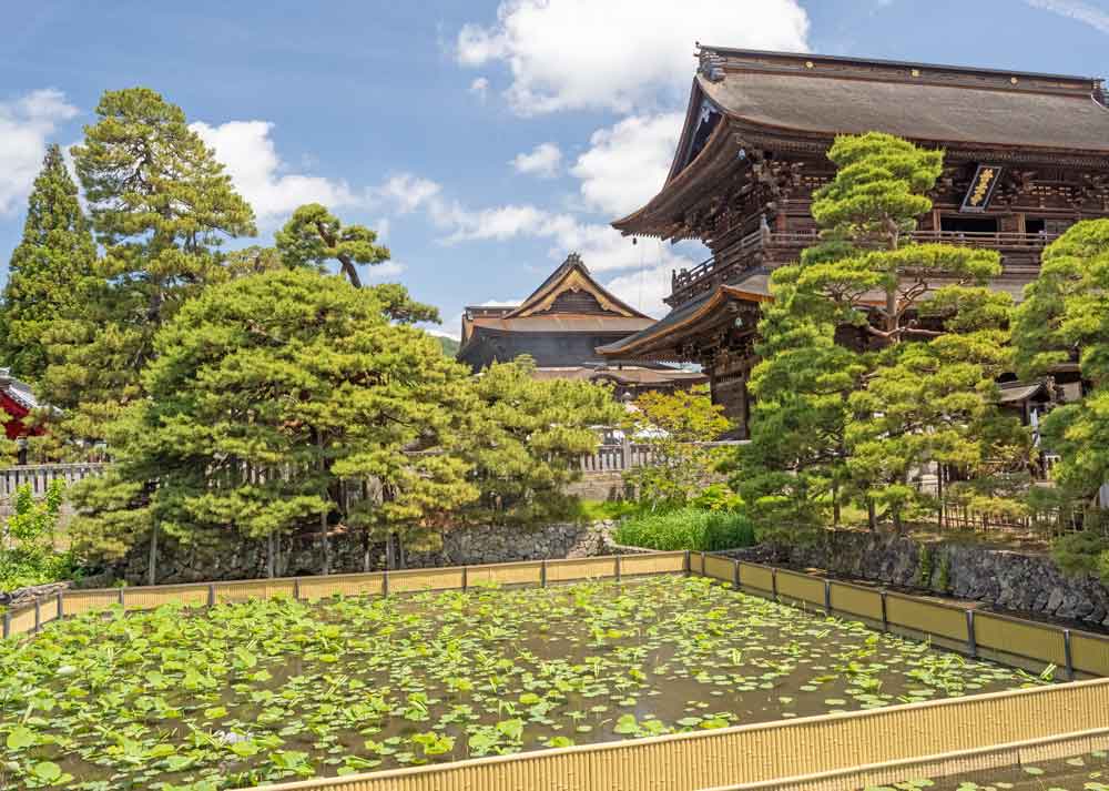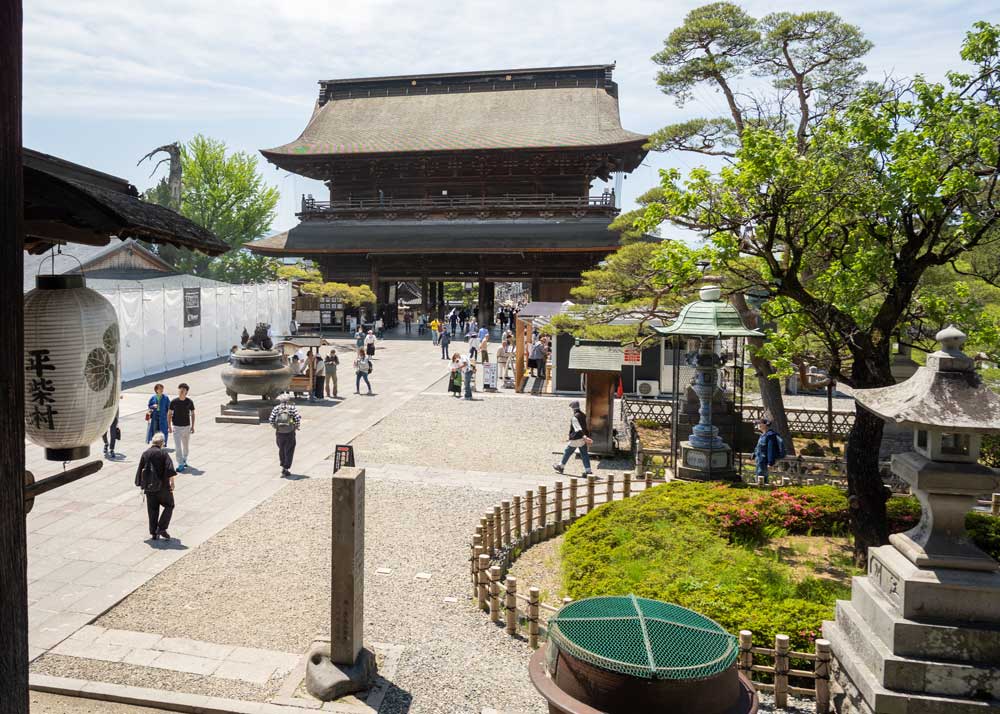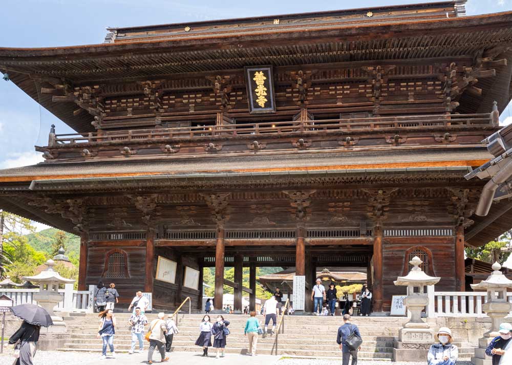 「善光寺」の額が掲げられ、この文字の中に五羽の鳩が隠されていると言われる。