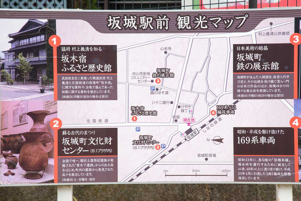 | 坂木駅前にあった観光マップの看板 鉄の展示館があり、この町が生んだ人間国宝、 故宮入行平刀匠と伝統を受け継ぐ宮入一門の 日本刀作品他が展示されている |