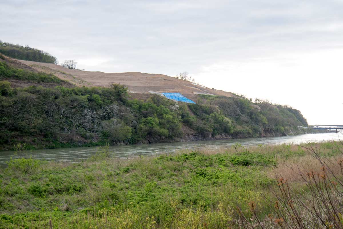 | この山地が掘削され消える 2022年5月撮影 | にとこみえ~る館の対岸の山地 「令和の大改修」実施中の表示がある |