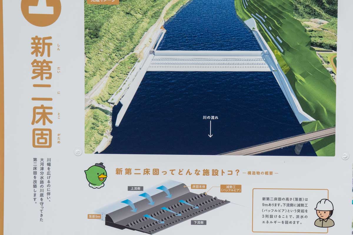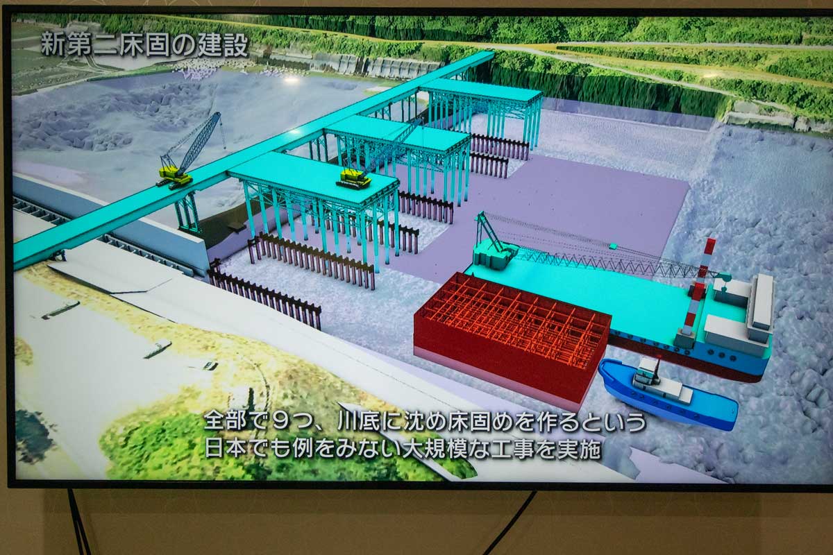 | 新第二床固工事 にとこみえ~る館から 2022年5月撮影 | 新床固本体の落差は9mあり、下流側に減勢 工という突起を3列設けることで洪水の エネルギーを弱める |