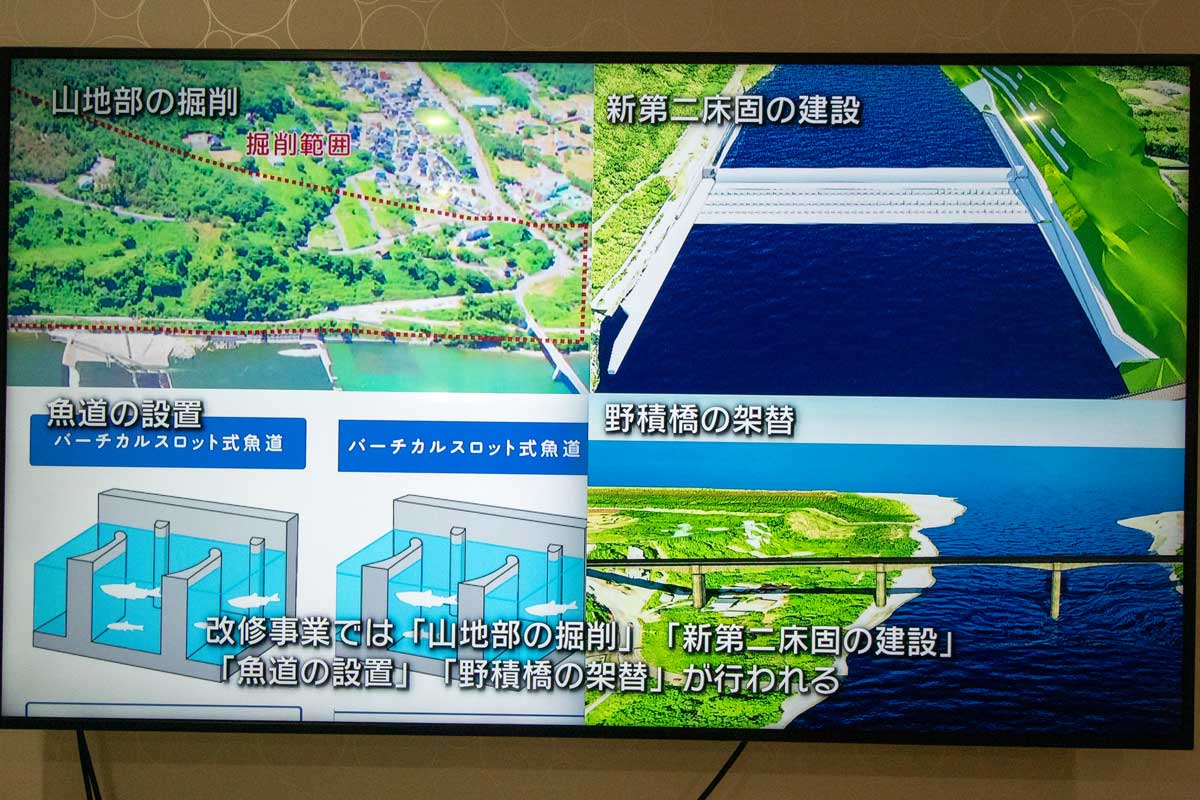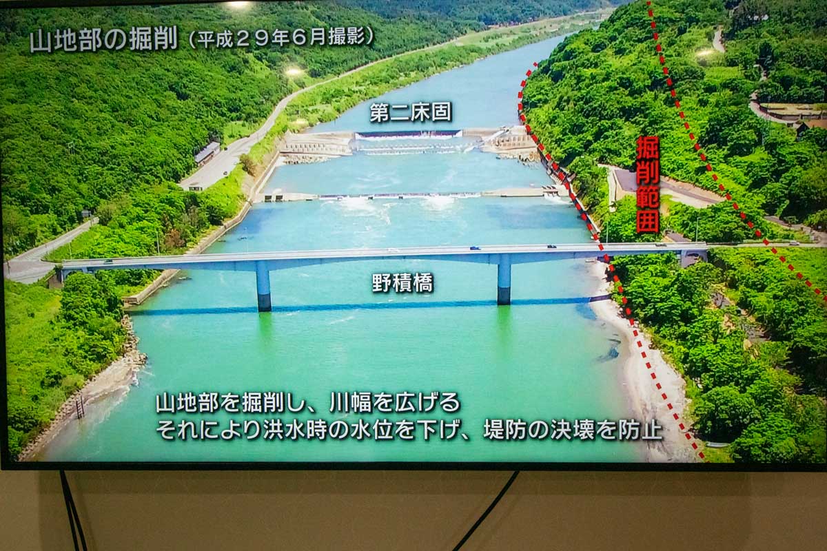 | 改修事業は上記の4つに加え、工事の見直しで事業区間より上流部を掘削し、 流量を従来計画の毎秒9800トンから1万1千トンに引き上げる |