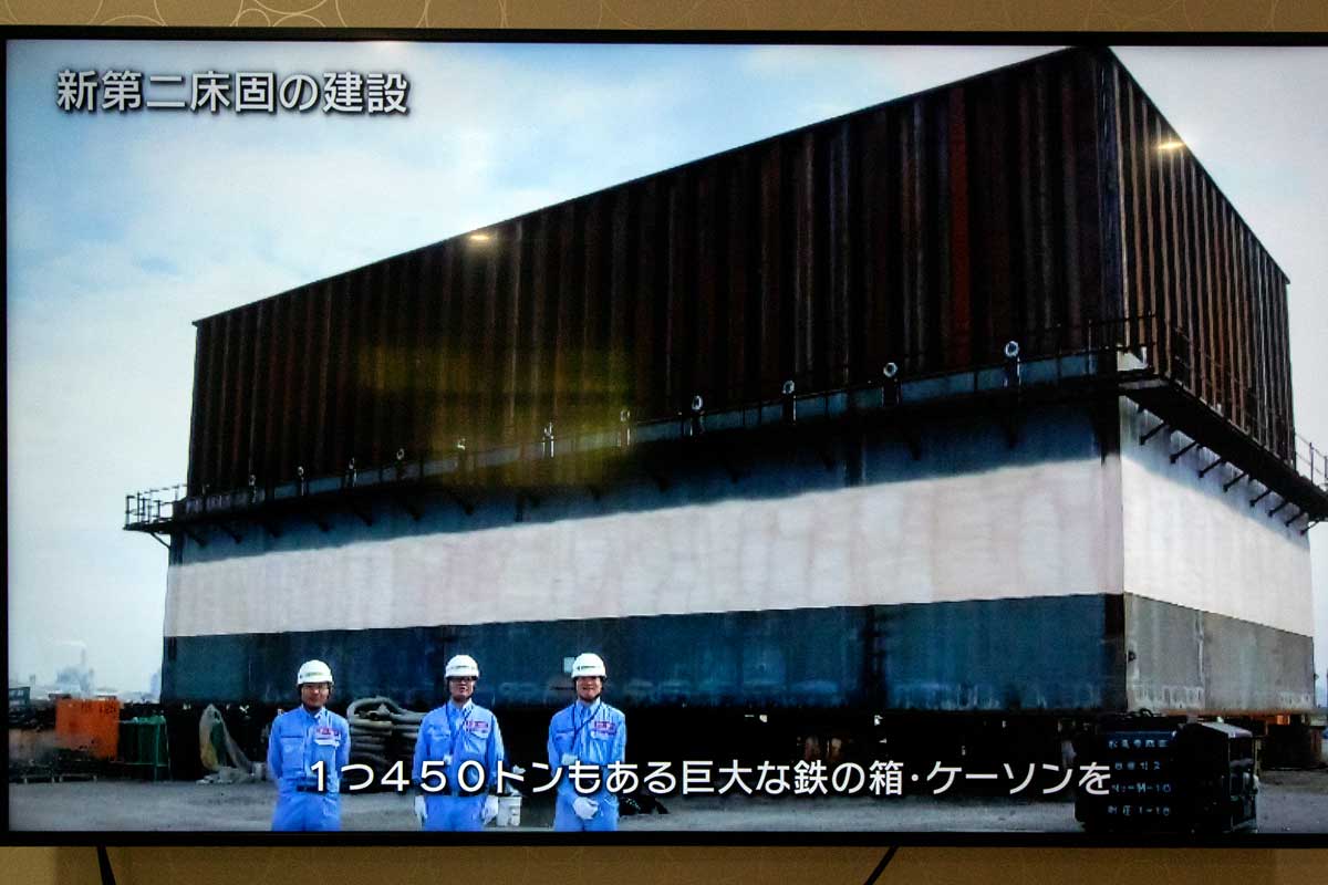 | 新第二床固の建設は1つ450トンもある 巨大な鉄の箱・ケーソンを・・・右へ | 全部で9つ、川底に沈め床固を作るという 日本でも例を見ない大規模な工事を実施 |