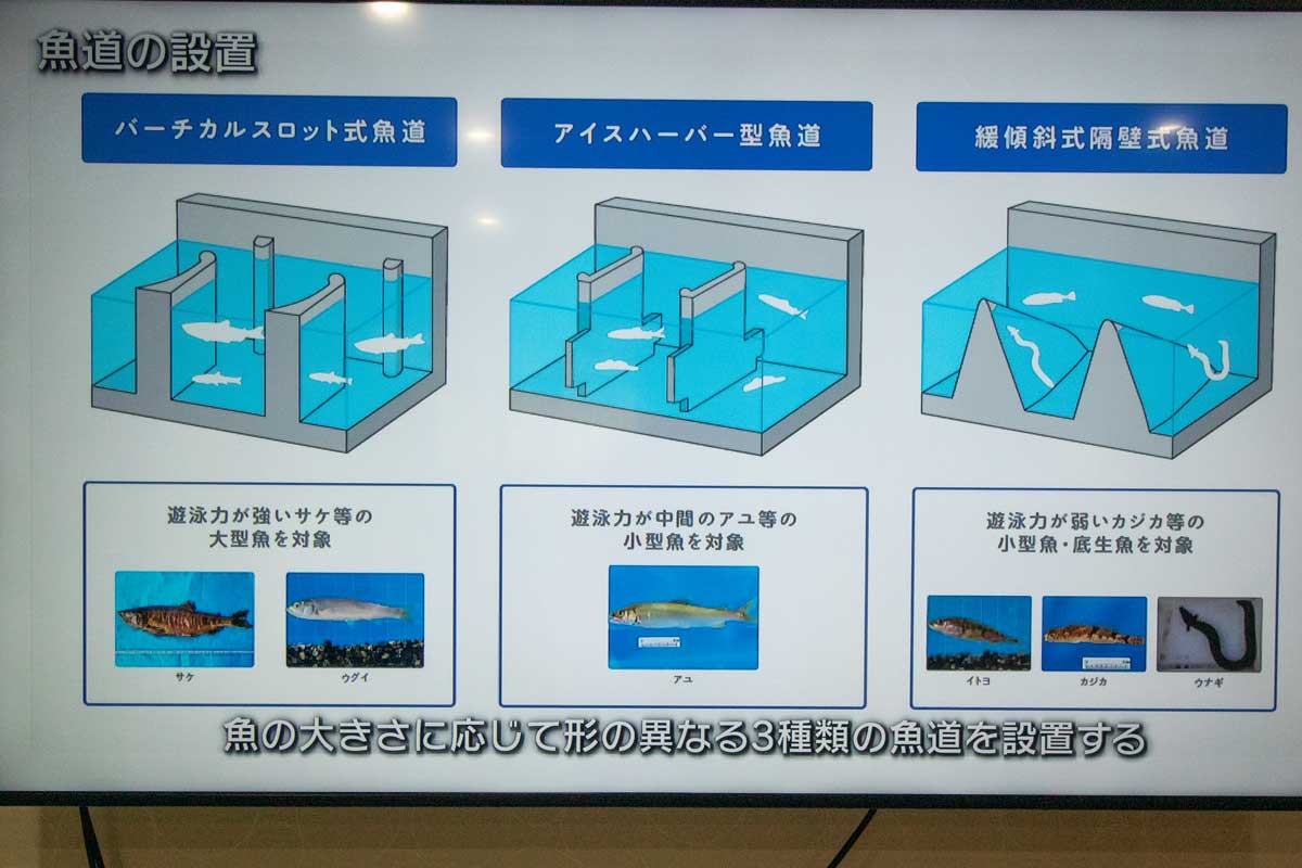 | 架替後の野積橋は現在の橋より200m下流 に移動、橋長は426m | 魚の大きさに応じて形の異なる3種類の 魚道を設置 |