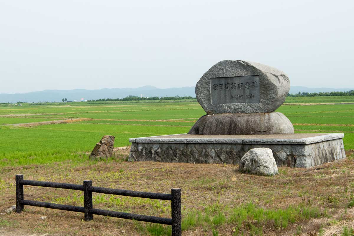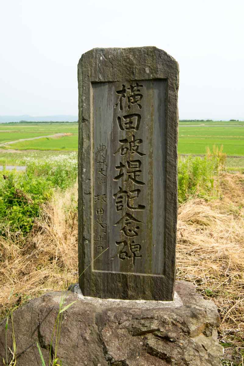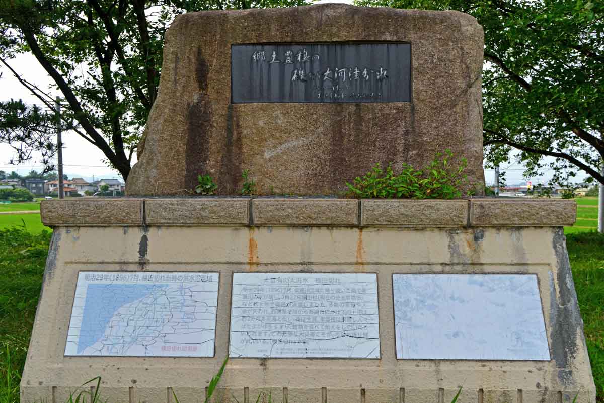 | 横田破堤記念碑 郷土豊穣の礎なり大河津分水 新潟県知事 平山郁夫書 左:洪水氾濫域 中:決壊状況 上記 右:信濃川洪水絵図 消滅 | 破堤個所は現在の燕市で大河津分水から 5㎞ほど下流にあたる 現在は広い水田が広がっている |