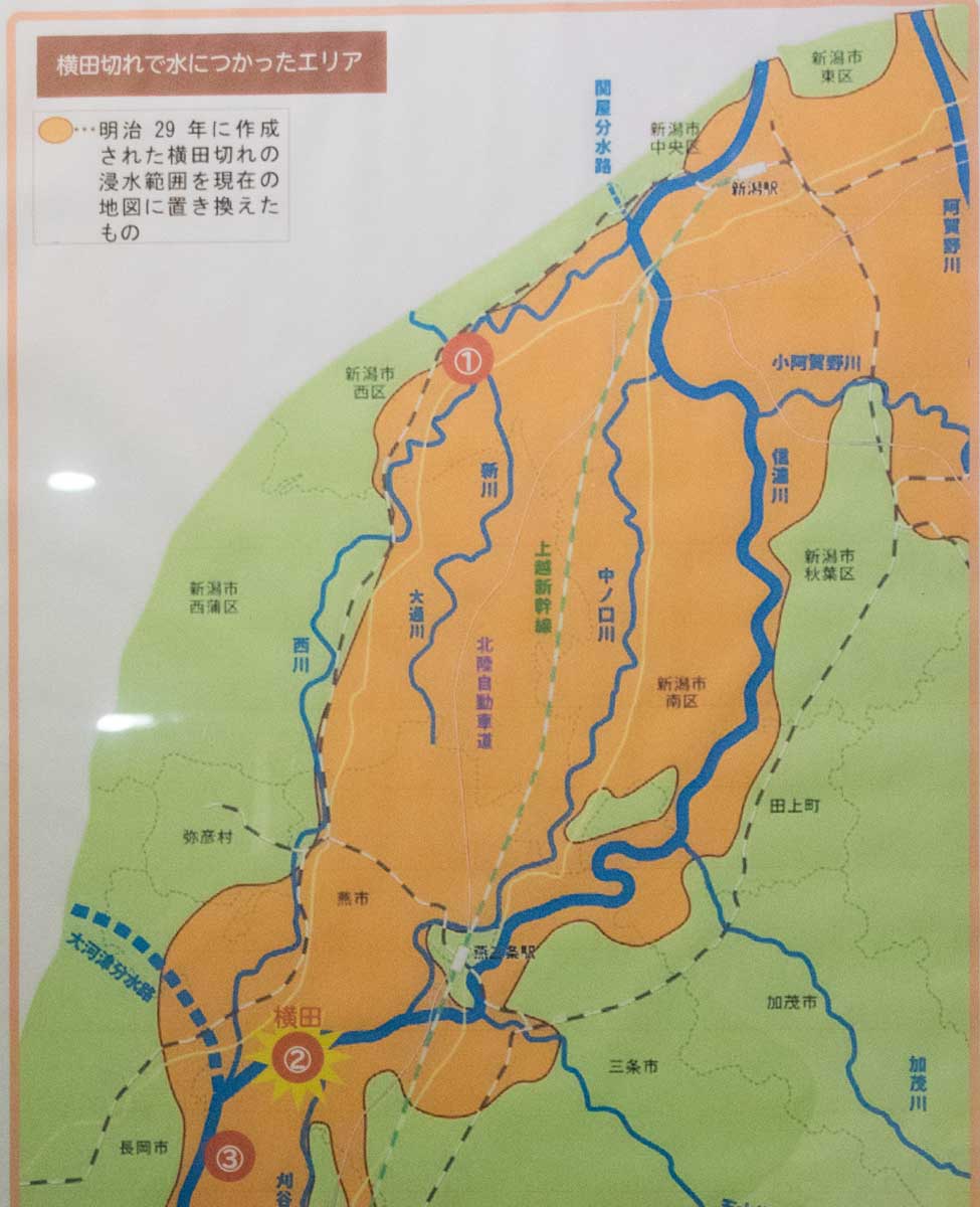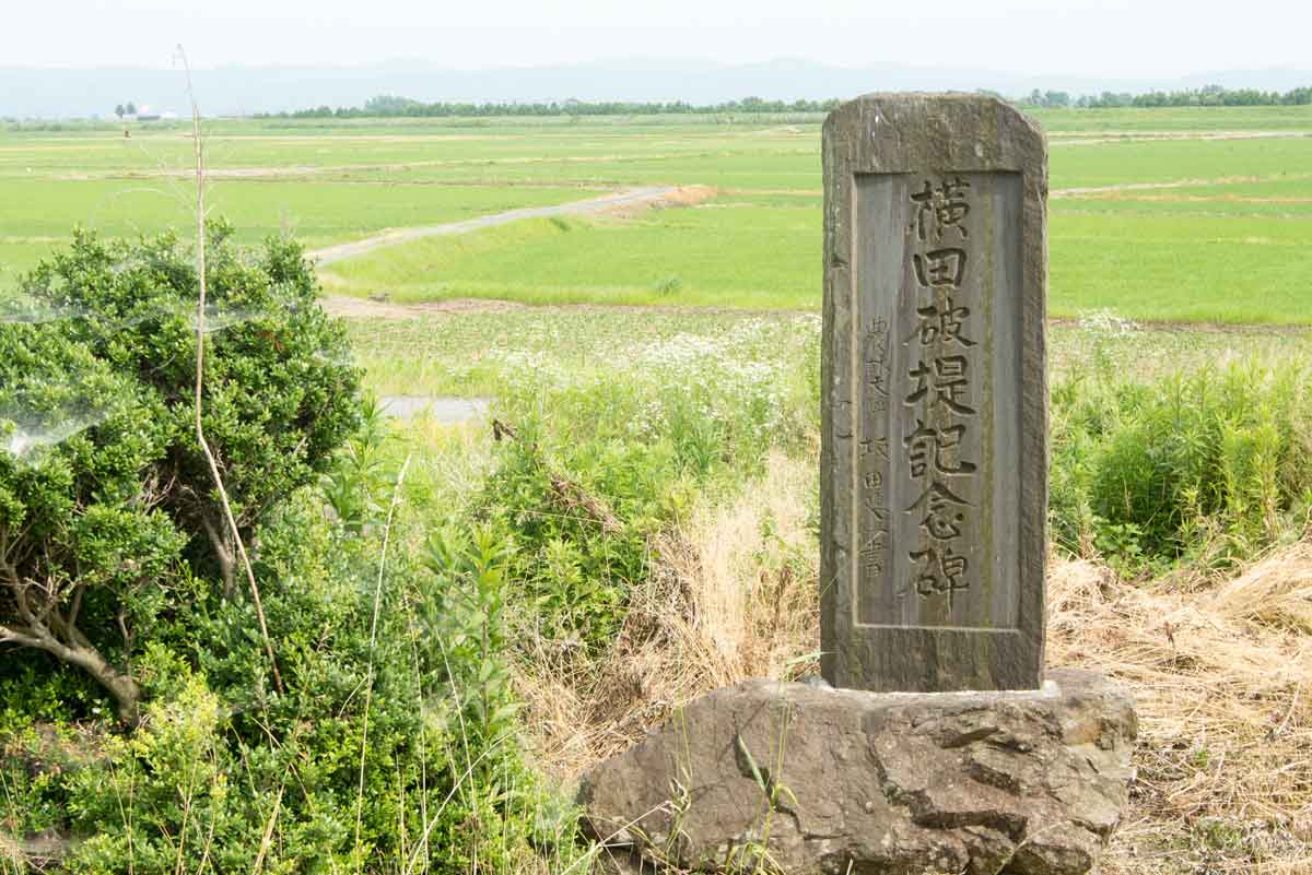 1896年(明治29年)信濃川流域に降り続いた雨で信濃川の水が増水し、7月22日橫田村など数カ所で堤防が決壊しました。多数の家屋や人名が失われ、西蒲原全域から新潟市にかけての一帯は約3ヶ月泥海と化し稲は全滅、米価格は高騰、人々はヒエガユをすすり、雑草を食べて飢えをしのいだといわれます。