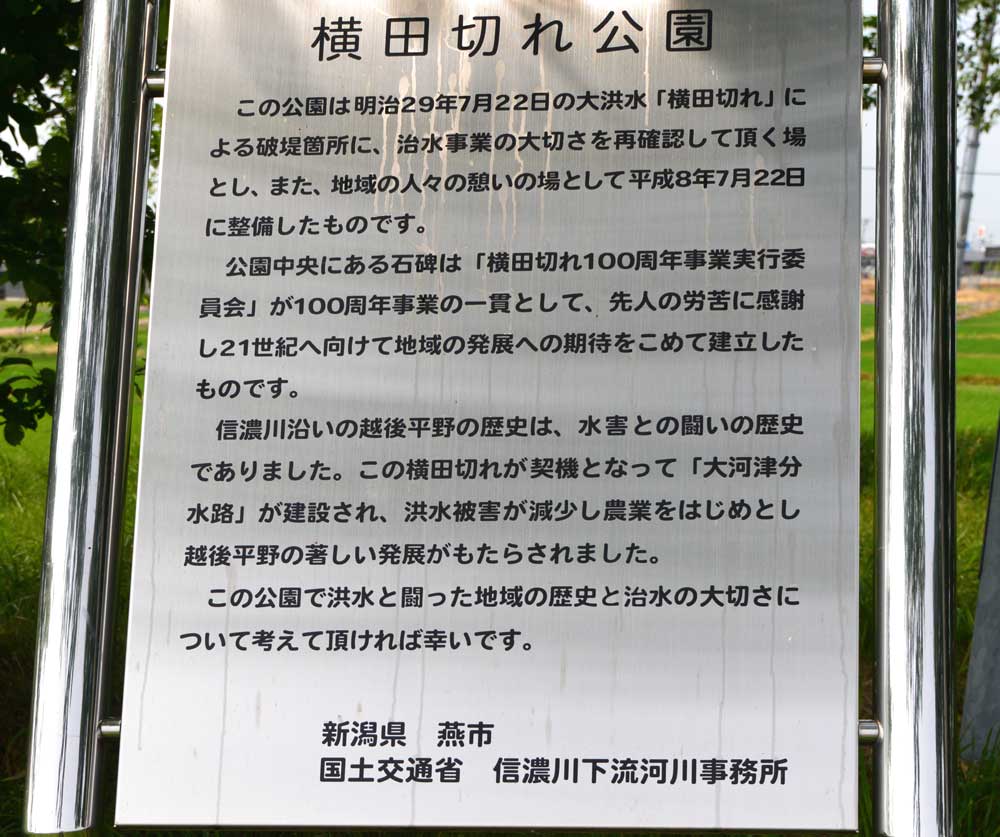 | 横田切れ公園 平成八年に横田切れ 100周年を記念して整備されたとある | 横田切れ公園 |