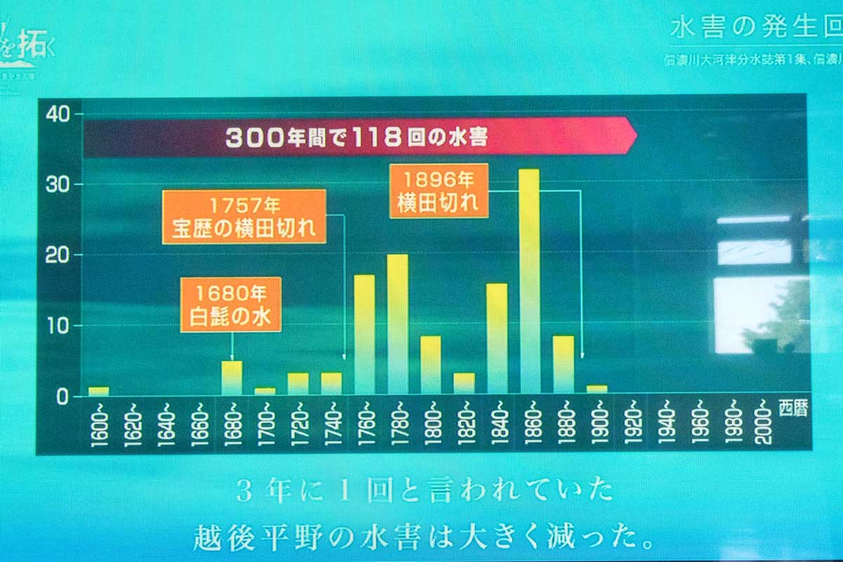 | 破堤付近にある横田開拓記念碑 新潟県知事 君 健男 | 1896年(明治29)以外にも 1757年(宝暦)にも横田切れがあった 横田切れをきっかけに政府は大河津分水工事 (第2期)を決定した |