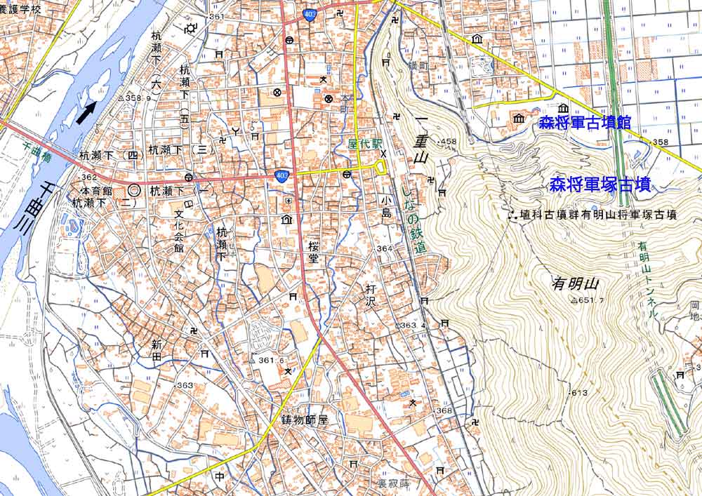 | 森将軍塚古墳と千曲市森将軍古墳館は千曲市 大字屋代にあり、最寄り駅はしなの鉄道の 屋代駅 | 千曲市森将軍古墳館前から後方の山の標高 490mにある森将軍塚古墳の一部が見えた 古墳館からの標高差は130m |