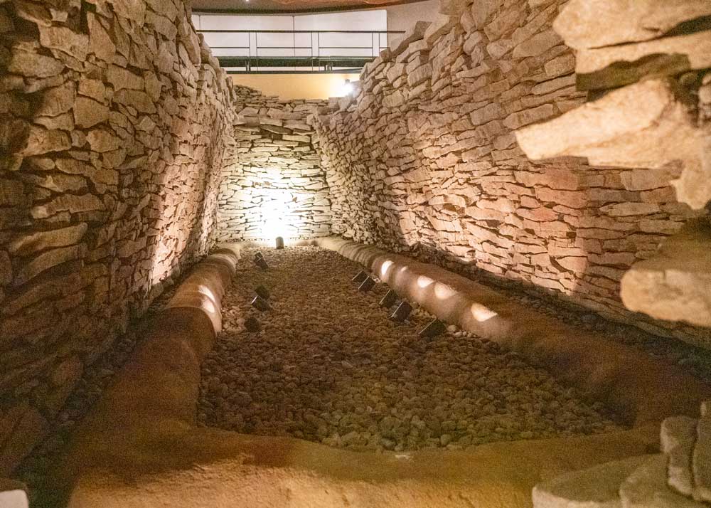| 前方部の説明 竪穴式石室2基、箱型石棺、 埴輪棺が見つかった | 王の石室は二重の石垣で囲まれた中央部 に設置され、石英閃緑岩の板状の石が小口 積みされている |