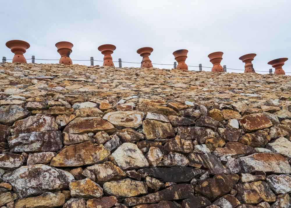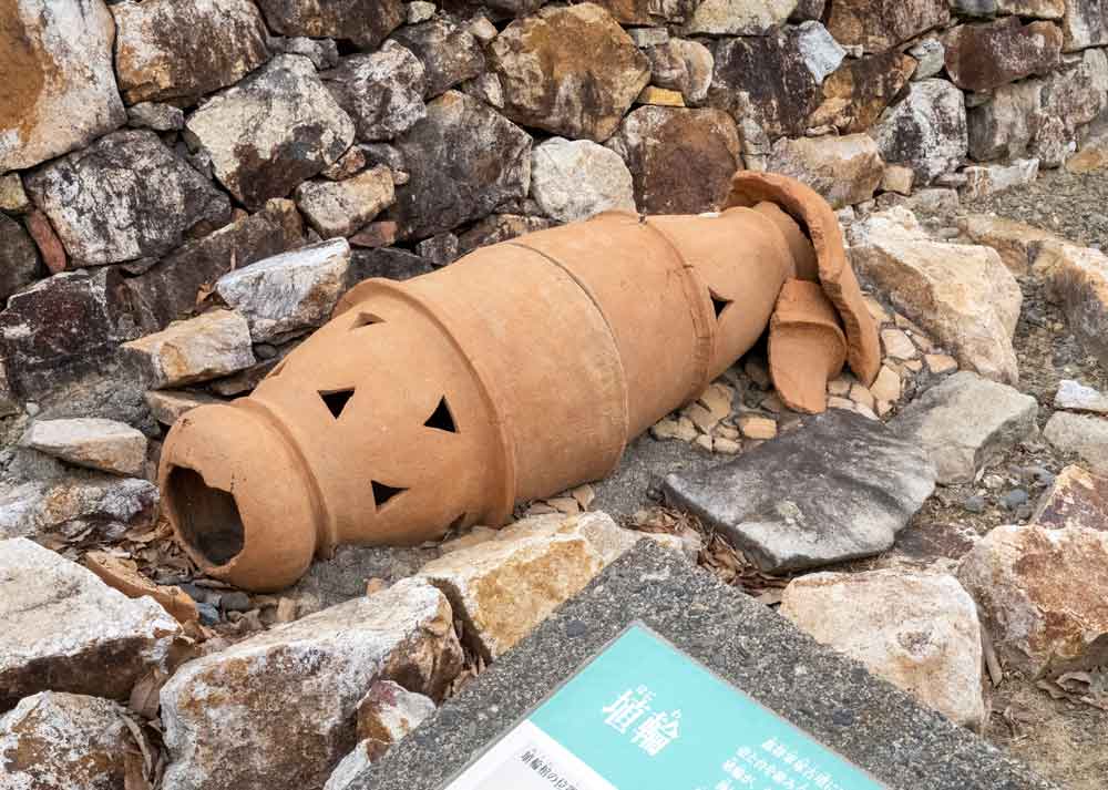 | 古墳外部の石垣の中は玉砂利が敷きつめ られて、周りに埴輪が立てられている | 埴輪棺が前方部横の石垣横から見つかった |