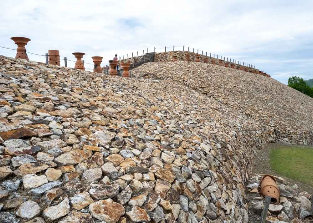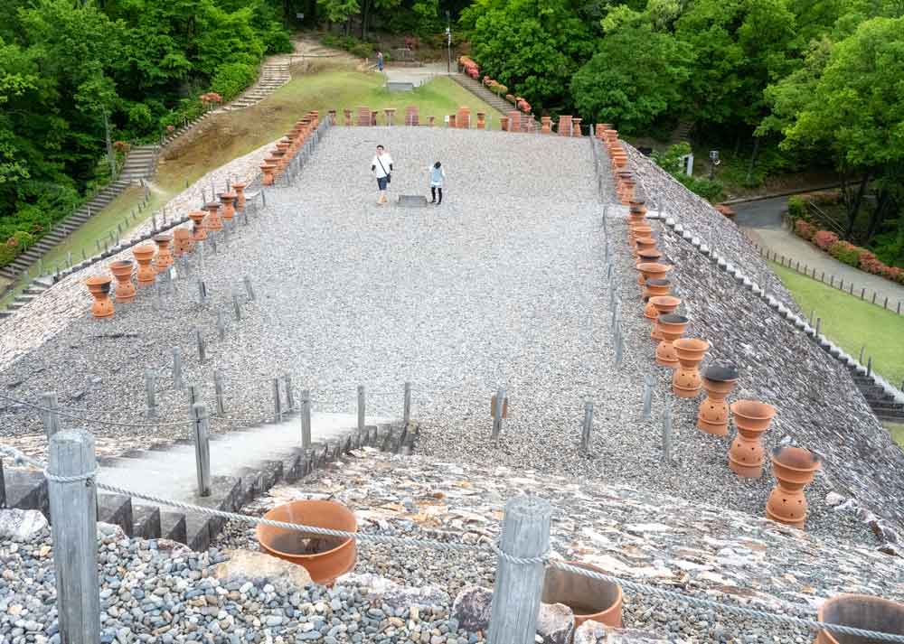 | 全長約100mの前方後円墳で約8万個の 石で覆われている | 古墳には壺形、朝顔形、円筒型など27種類 157個の複製された埴輪が立ち並ぶ |