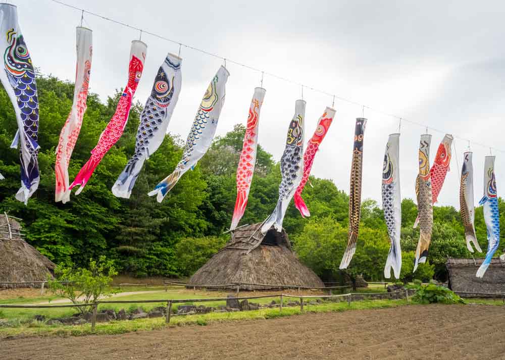 | 古墳山麓にある科野のムラ 高床式倉庫 倉庫横のトチノキは花が満開だった | 科野のムラ 竪穴式住居に鯉のぼり 訪問2024年5月6日 |