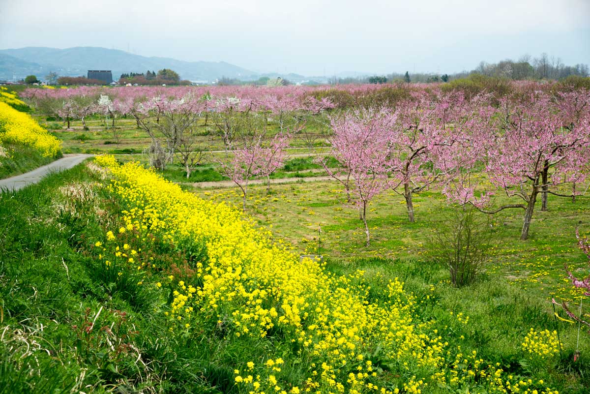 | 穂保から2km強上流にかかる村山橋 ここの川幅は約720m 2022年1月23日 | 村山橋上流部の広い河原は華やかに彩られていた 2022年4月23日 |