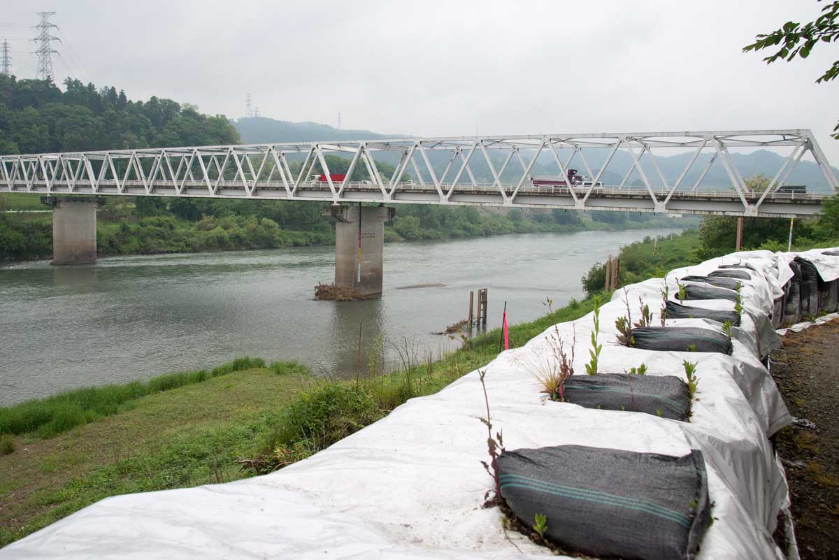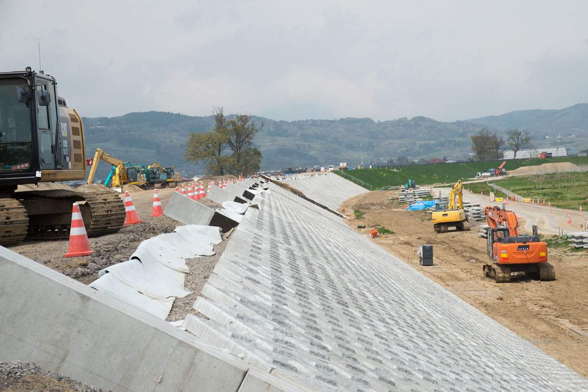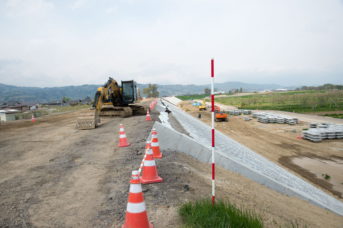 | 穂保堤防決壊点の川側の修復工事 | 川側の法面はコンクリートブロックが張られていた |
