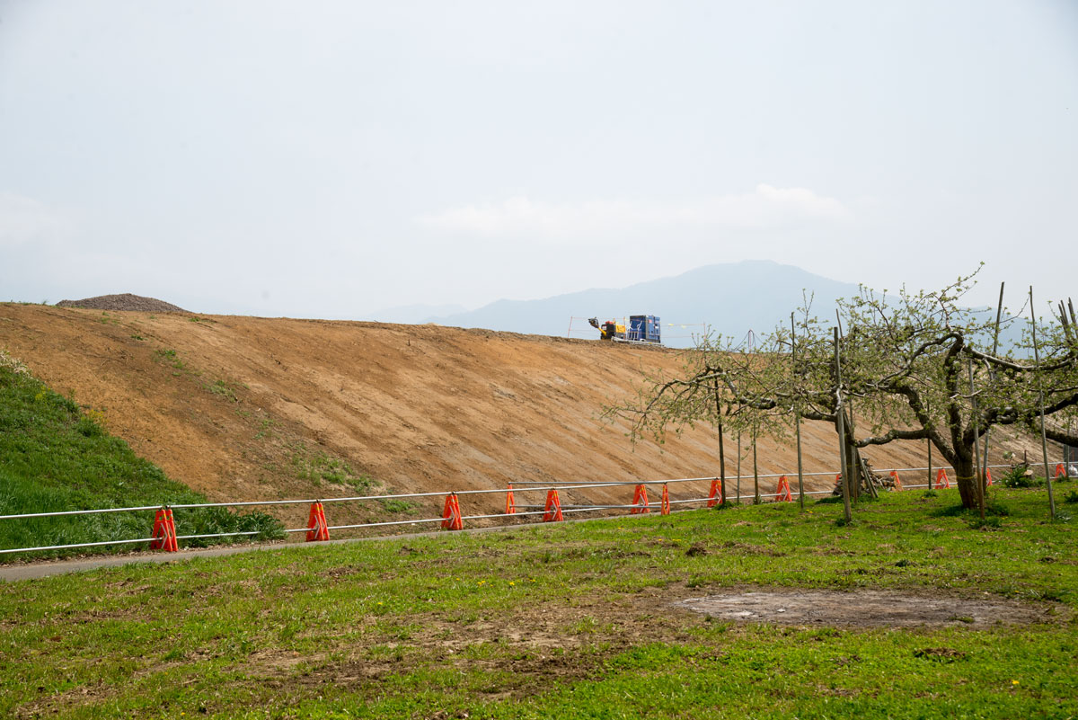 信濃川紀行の取材で訪れた際に、穂保決壊点を知り修復工事の様子と付近の様子を撮影した。穂保地区はりんご畑が多いが、今年も負けずに花をたわわに付けていた。 2022年4月23日