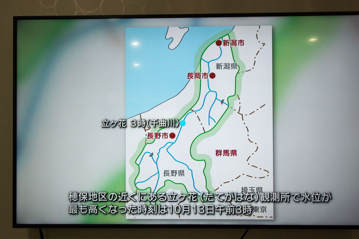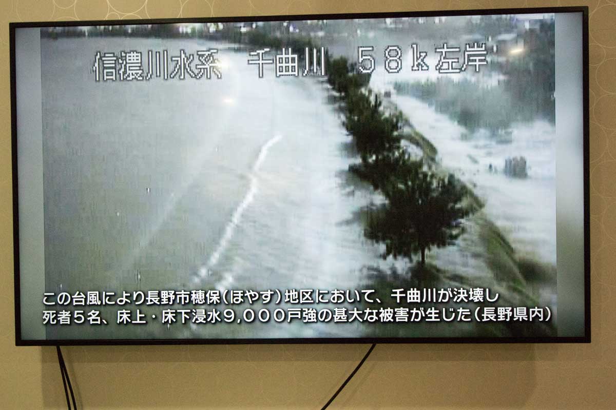 2019年10月12日に猛烈な風雨を伴う台風19号が長野県に最接近し、一夜明けた13日、千曲市から飯山市にかけての千曲川流域で氾濫被害が広がった。長野市穂保では村山橋下流左岸の堤防が約70mにわたって決壊。家々が濁流にのまれ、2階近くまで水に漬かった住宅も出ている。