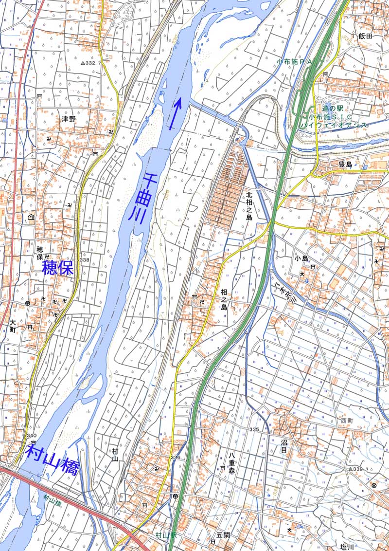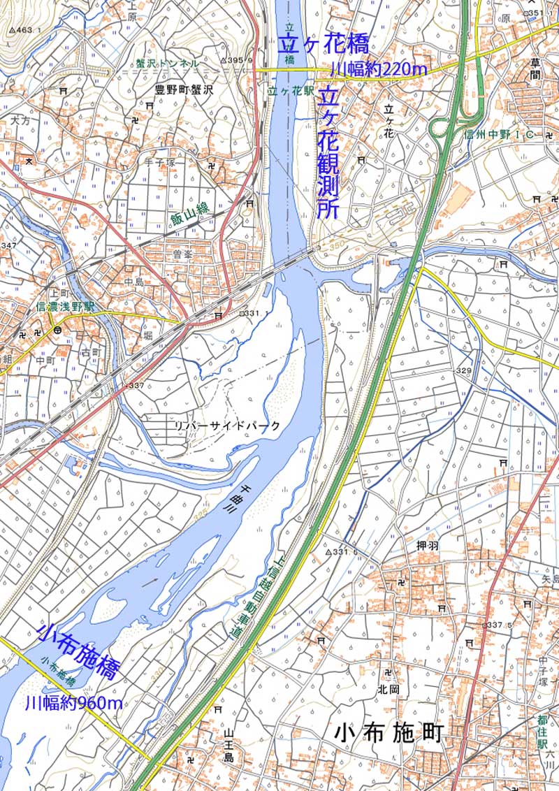 | 落合橋で犀川と合流後は川幅が広くなり、 穂保で約850m、小布施橋で約950mもあり、 広い河川敷と高い堤防を見たかぎりでは、 決壊と越水が発生したことが信じられ なかった 国土地理院の地形図使用 | 穂保からおよそ7km下流の立ヶ花橋の川幅 は約220mに狭められ、上流部の1/4程度し かないため、吐き出せず穂保の水位が上が ったものと思われる 川幅は左右岸の堤防間距離を地形図で測定 |