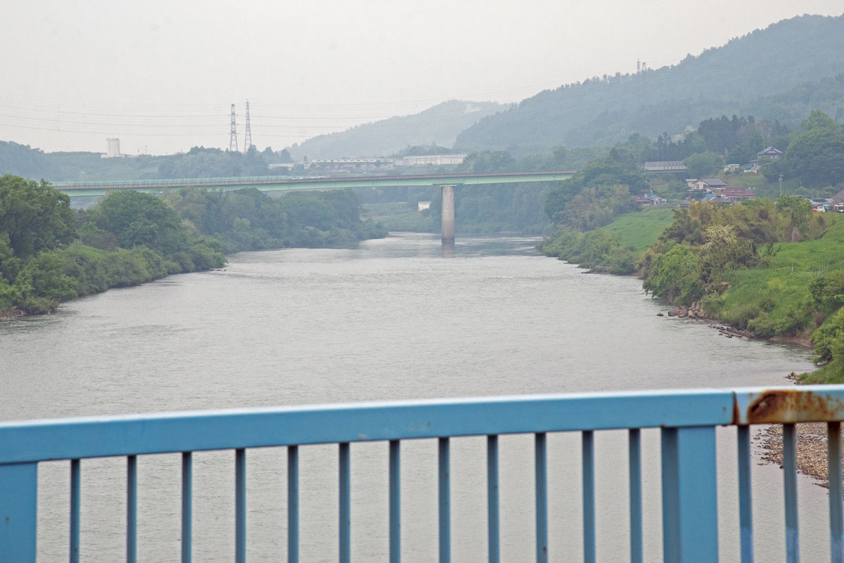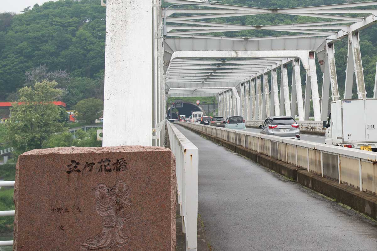 | 立ヶ花橋橋脚にある水位標識、一番上の紫色 は氾濫危険9.3~10.6m範囲で、13日午前 3時の水位12.46mはこれをはるかに越えて 橋脚上の橋台 まで上がったことになる | 立ヶ花橋、ここの川幅は約220m 2022年5月21日 |