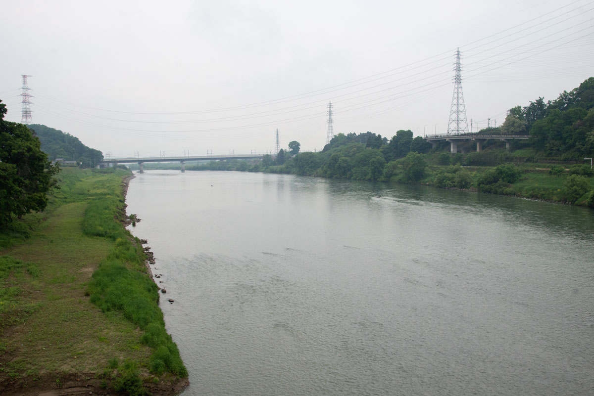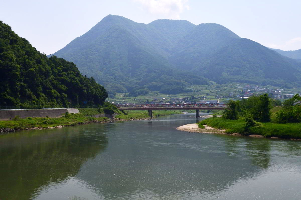 | 立ヶ花橋の上流の川幅 | 立ヶ花橋下流にある下今井橋から上流部を望 む 緑の橋は上信越自動車道 |