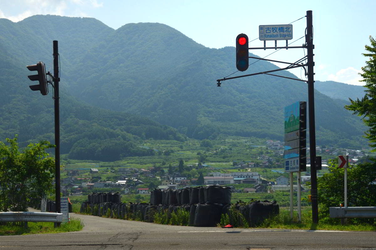 | 古牧橋の上手の川幅は約170mで狭い 後方は高社山 | 古牧橋北信号付近も越水したらしく、フレコン が2重積されていた |