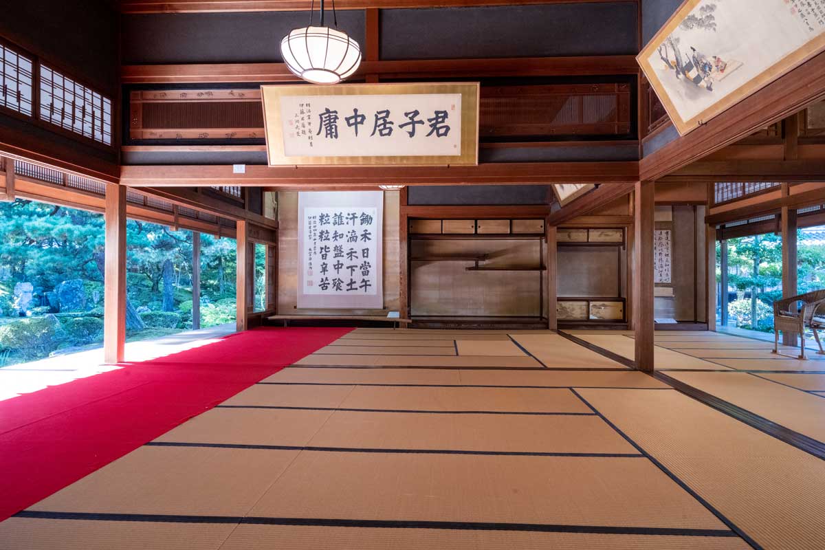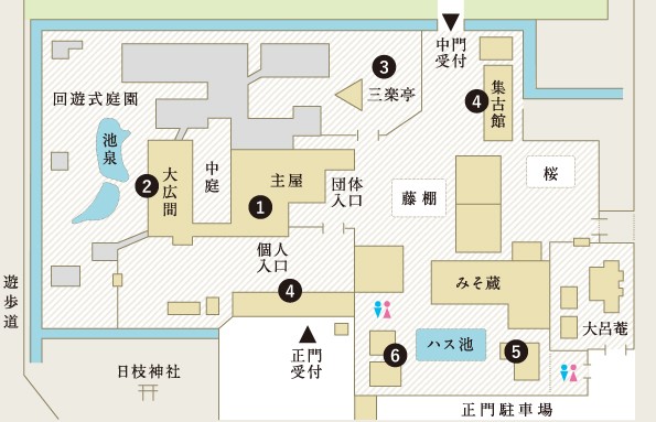 | ①主屋棟 ②大広間棟 ③三楽亭 ④門土蔵・飯米蔵 ⑤離れ座敷 ⑥移築古民家 | 大広間は約100畳の書院造で大玄関と直結 敷居に桜材、柱に杉の四方柾、廊下に欅材 が使用されている |