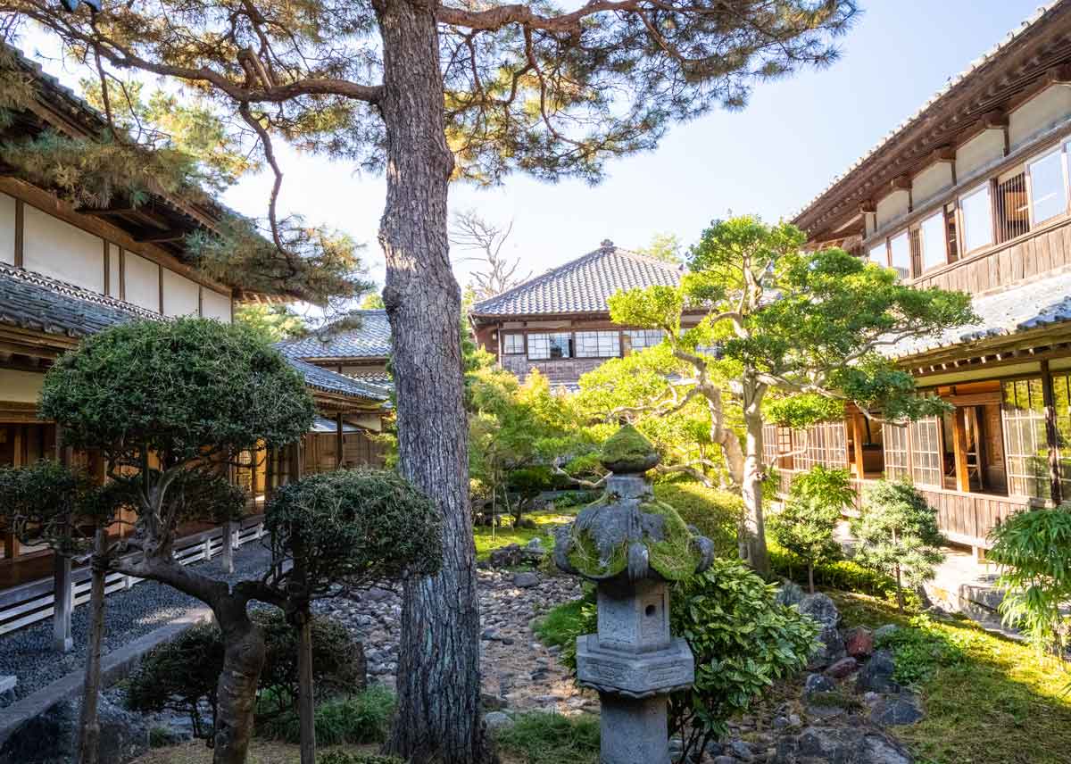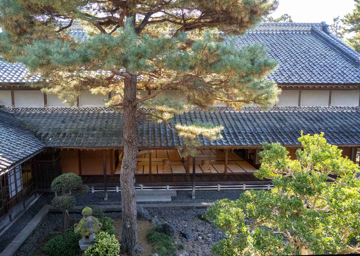 | 主屋棟の二階から大広間(平屋)と中庭を望む | 中庭を挟んで 左大広間棟、右主屋棟 |