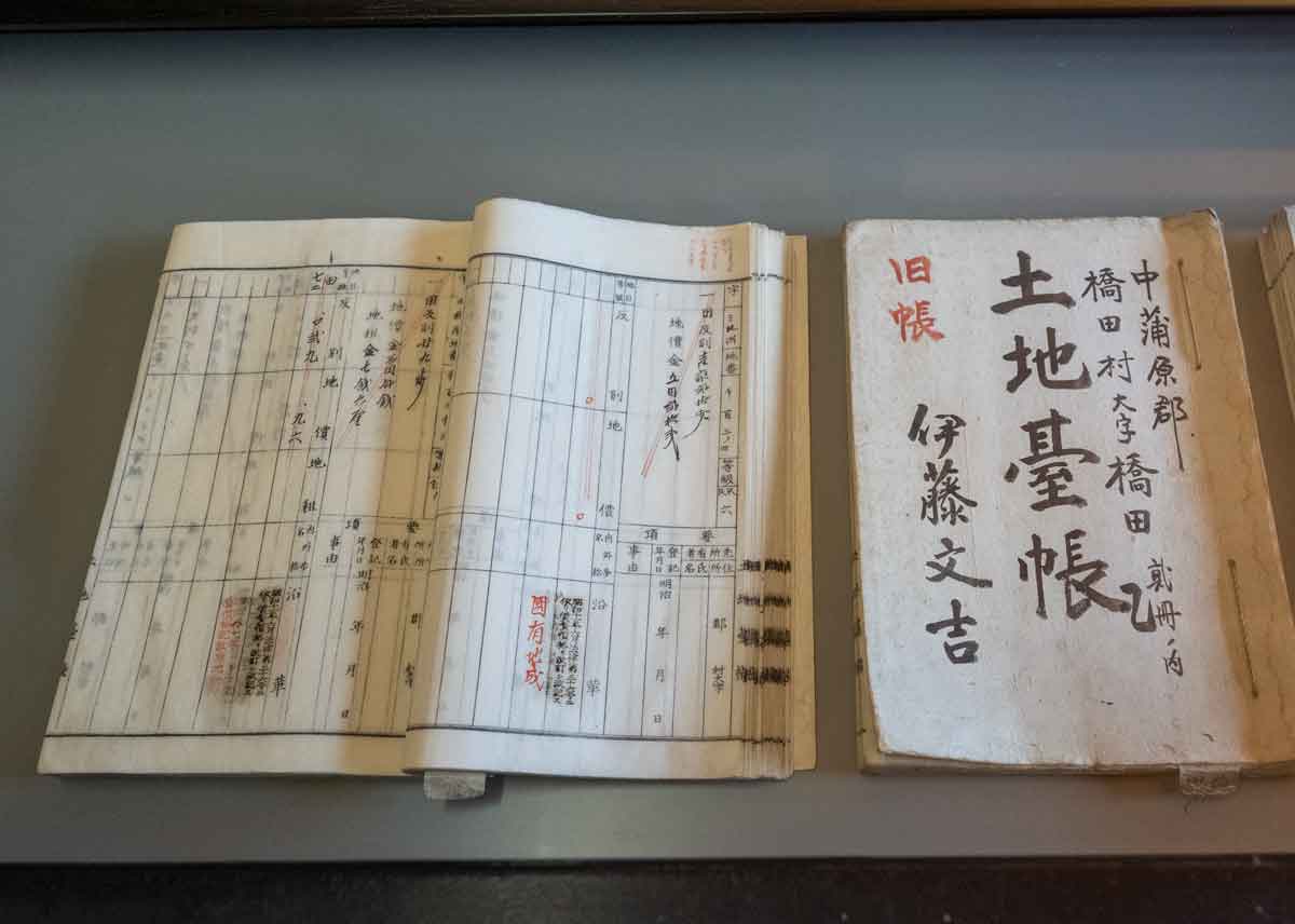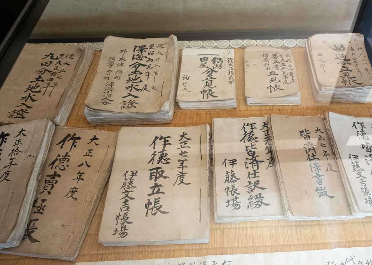 | 主屋棟の二階は女中や伊藤家の子供らが過ご して居た所で、現在は考古資料室になっている | 考古資料室には土地台帳や作徳取立帳など が展示されている |