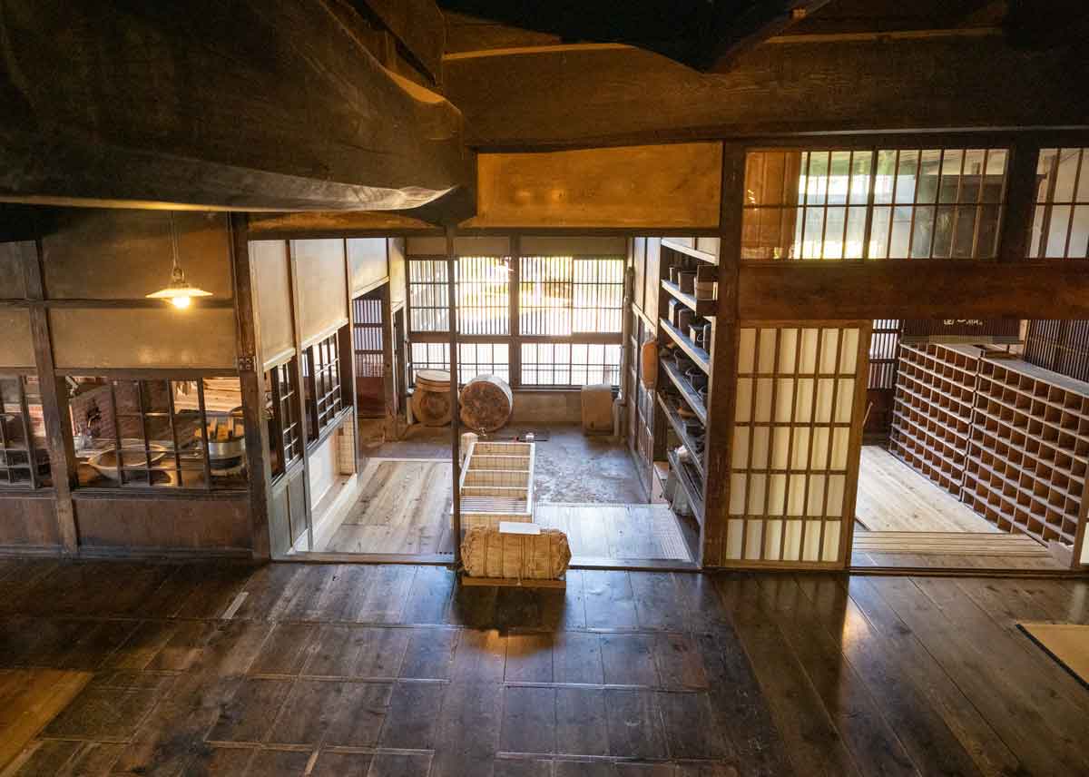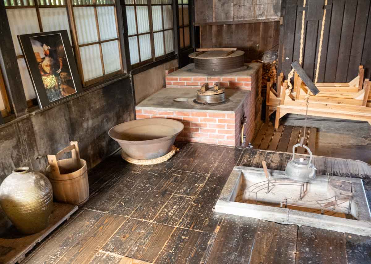 | 台所 右端に台所の囲炉裏があり、 左奥にかまどがある | 当時50人の従業員が働いていて、このかまど で60㎏(一俵)の米を毎朝炊いていたという |