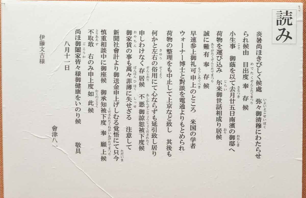 | 会津八一書簡 東京の落合の住宅を空襲で罹災 した後、新潟に帰郷して、伊藤文吉別邸に移り 住んだ時のお礼遅れのお詫び文書 昭和21年8月11日付け | 新潟市ににあった別邸は「南浜秋艸堂」 と呼ばれ、八一は昭和21年7月25日から 亡くなる31年11月30日までここに住んだ |