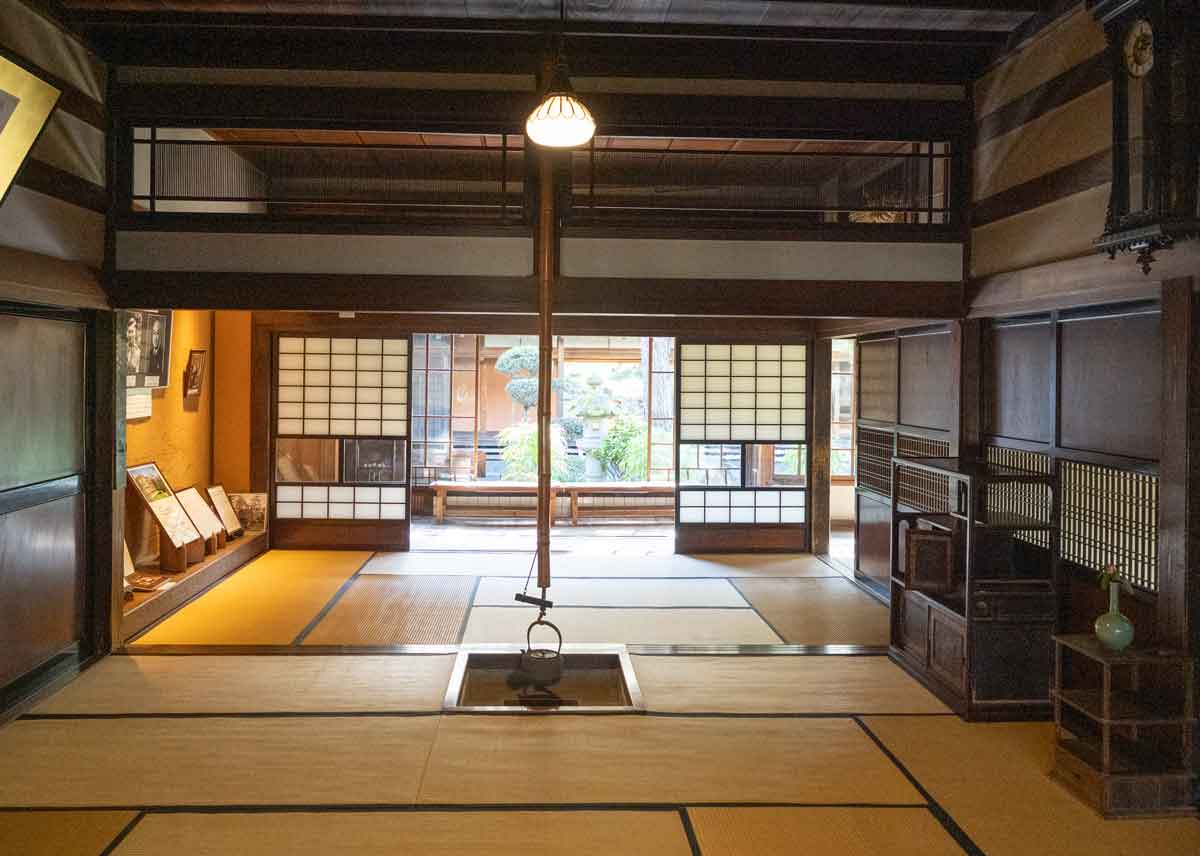 | 茶の間 三間続きで合わせると27畳 | 台所囲炉裏 六尺四方の囲炉裏には一度 で16人が座れるという |