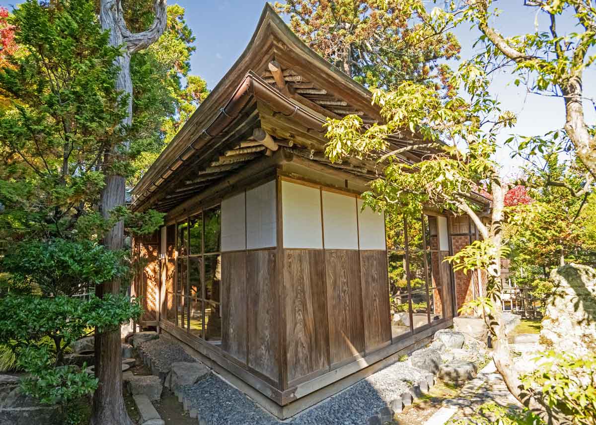 | 正三角形形の小亭で建坪11坪余の書斎兼茶室 | 三楽亭の柱、建具、畳のほとんどが 三角形やひし形の独創的な建物 |