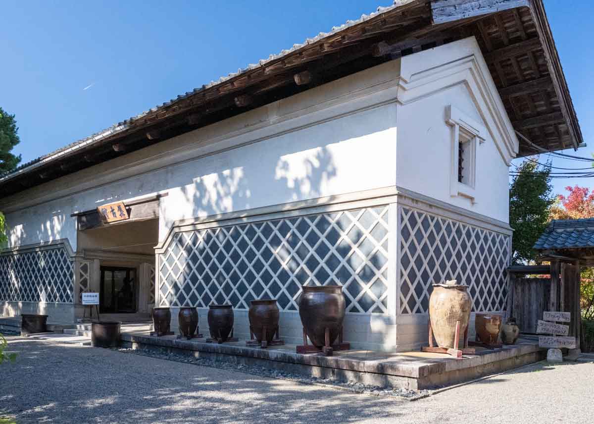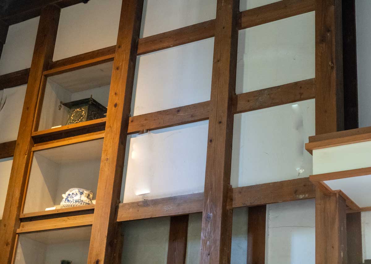 | 現在集古館として唐三彩やエジプト・ペルシャ などの古美術の展示館になっている 屋根は置き屋根 | 集古館は元は飯米蔵で米を2000俵を備蓄 していた、天井まで積み上げられた俵が外壁 に直接触れて崩壊しないよう、格子風の 「俵止め」が組まれた、 また、屋根も通気性を良くするため置き屋根に なっている |