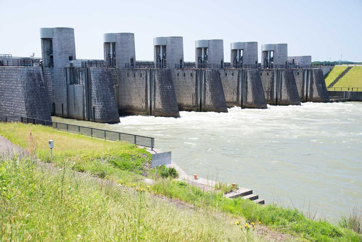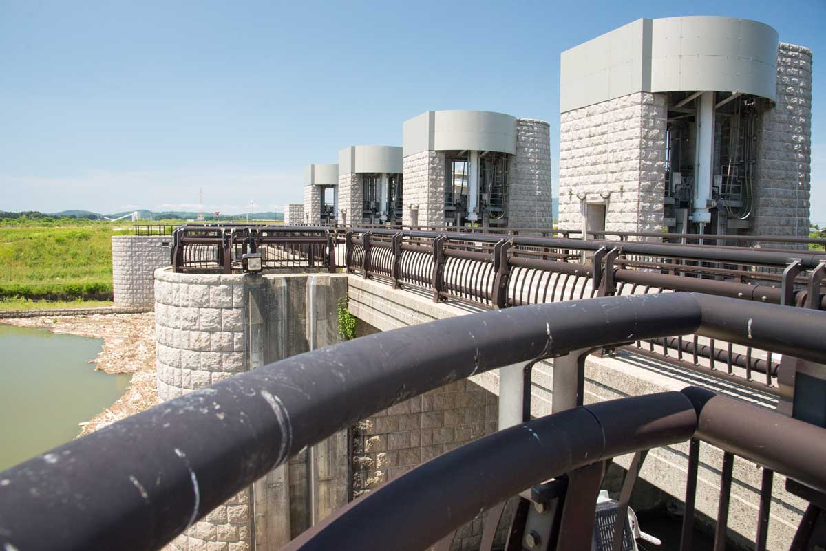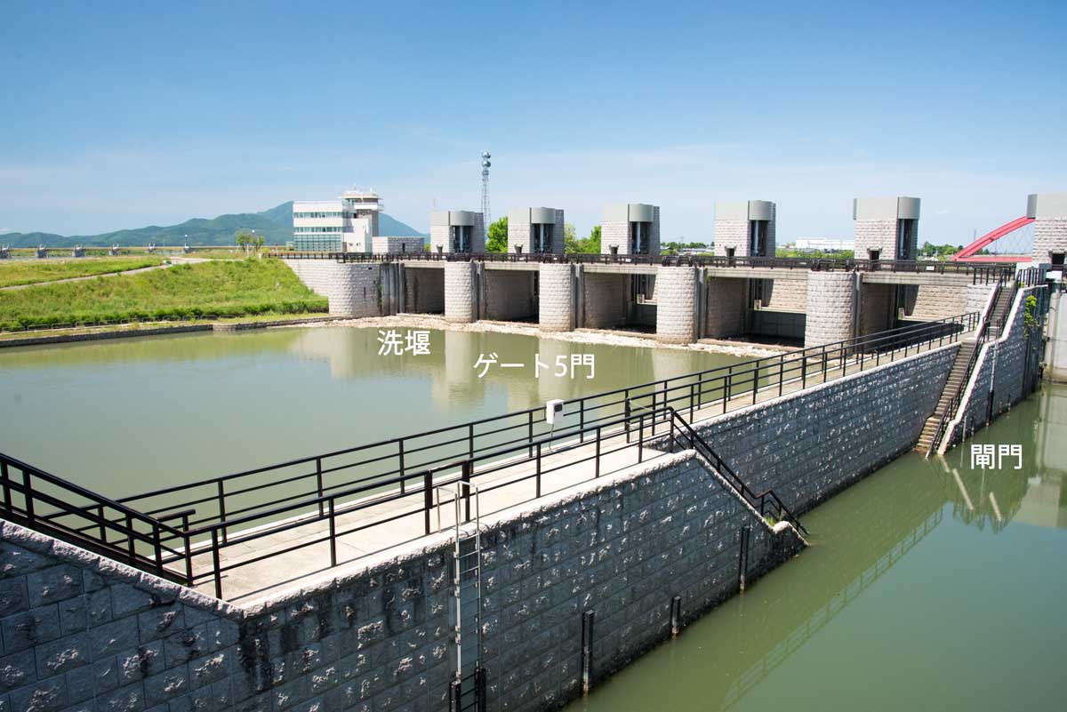 ラジアルゲートを6門設置、その内左右4門はゲート上部に可倒式のフラップゲートを取付