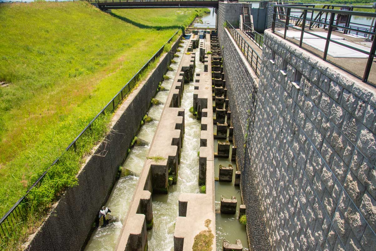 魚道が両岸に設けられ、右岸は3つの魚道が