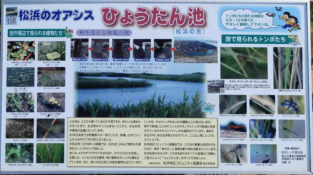 | 池にはメダカやフナやライギョのほか、ヌマエビなども生息し、水面にはヒシなどの水生 植物、希少植物のオニバスも葉を広げています。また、周りの砂丘地には海浜植物も生えて います。トンボはチョウトンボをはじめ16種以上が飛び交います。 上記看板の説明 |