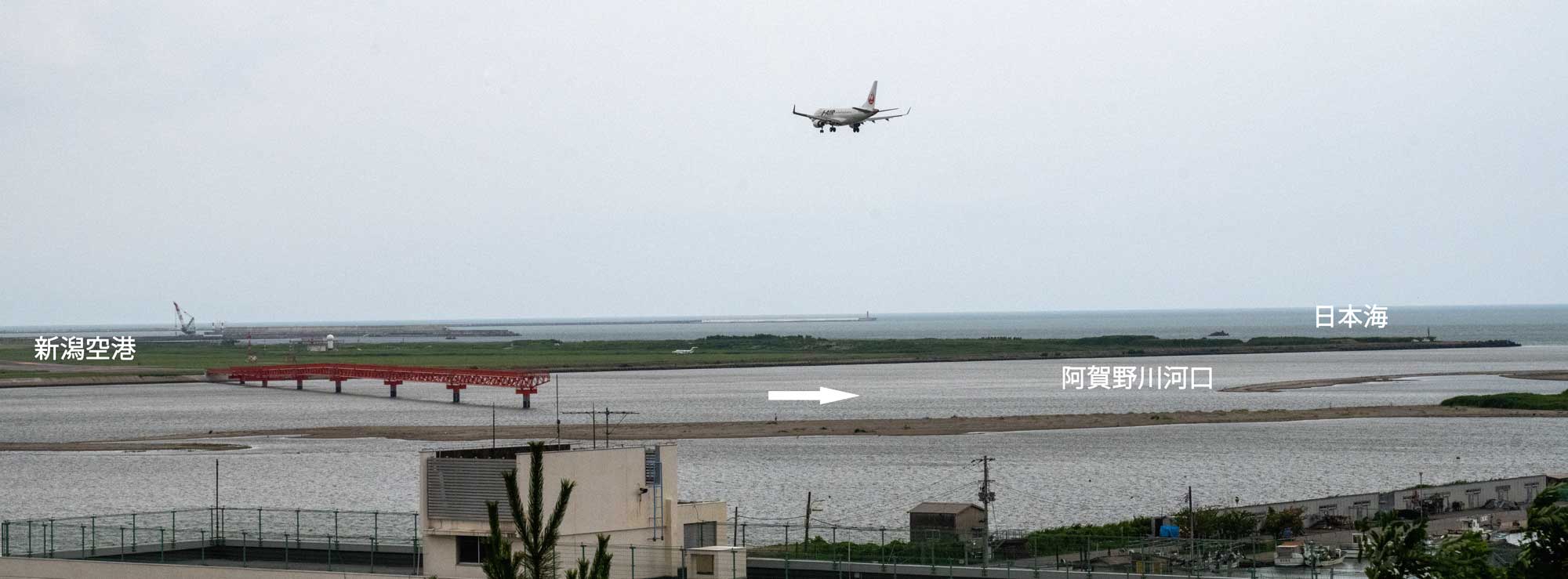 | ひょうたん池は阿賀野川河口の右岸の砂丘の中にある。河口左岸には新潟空港がある。 |