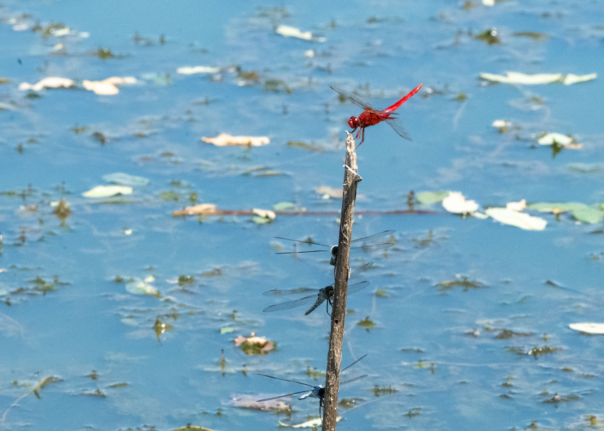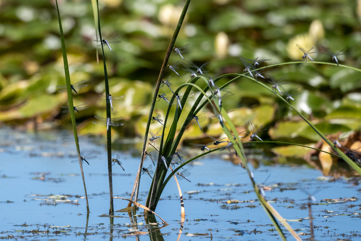 1ヶ月後に再訪したら、多種のトンボが現れていて、コフキトンボが群れて休ん