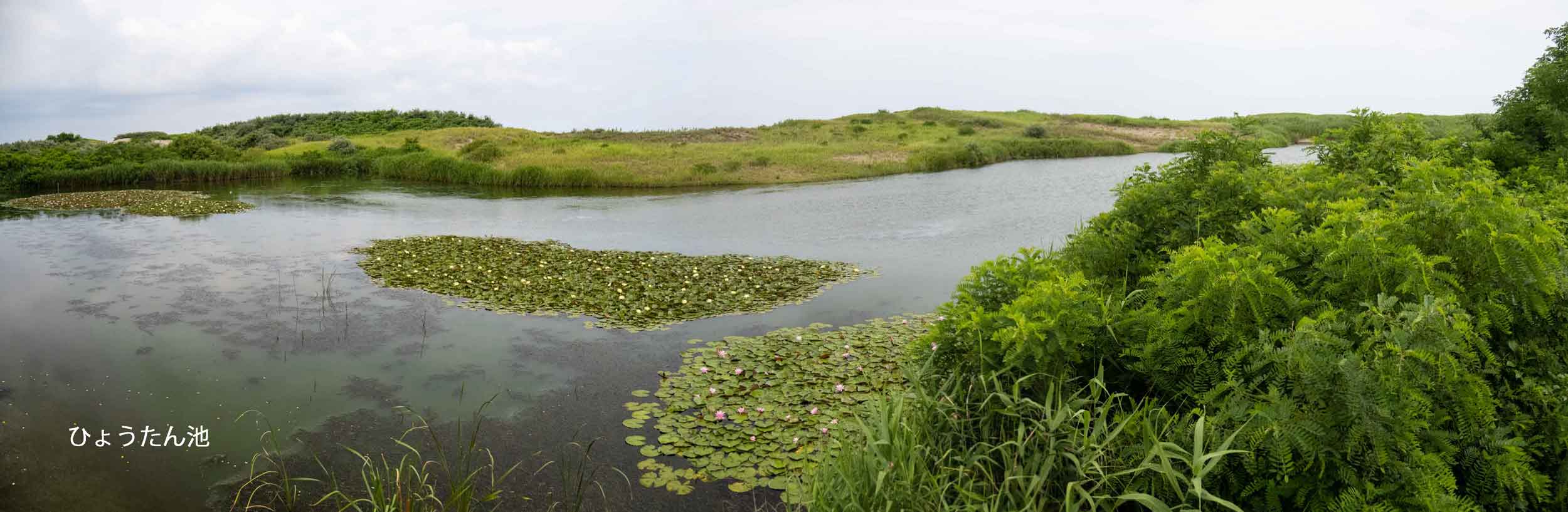 ひょうたん池の向こうに日本海が広がり、海岸から約100mしか離れていないで、