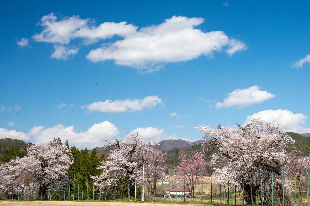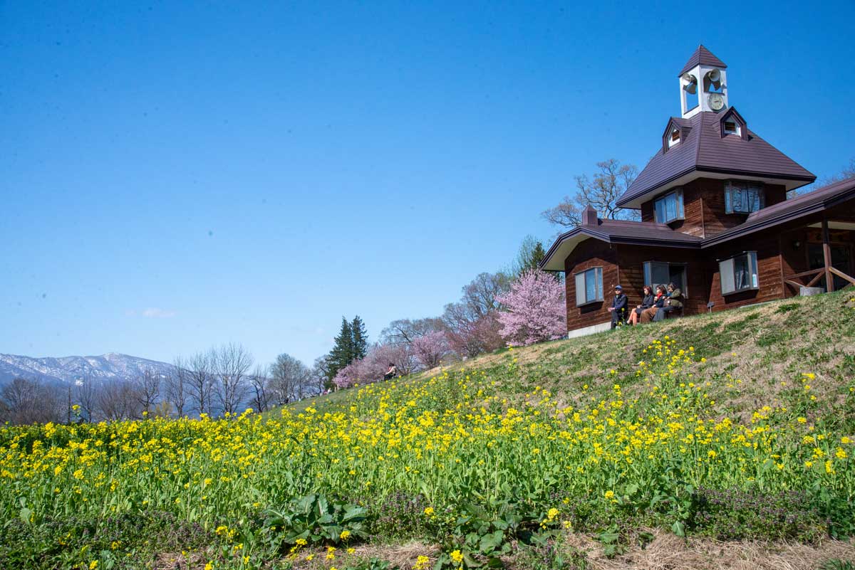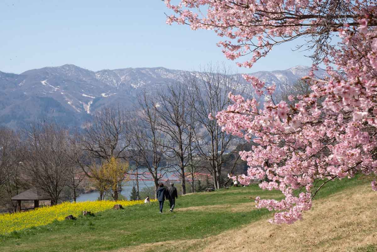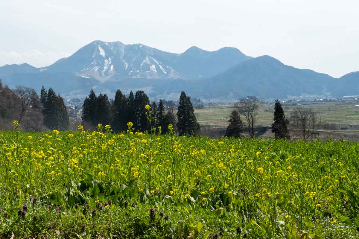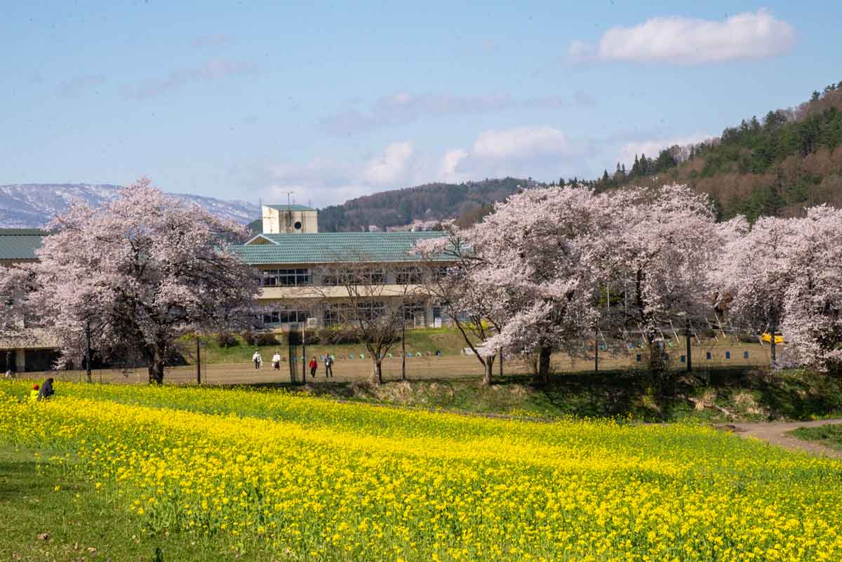 | グランドの桜越しに千曲川と高社山を望む | 菜の花は五分咲き 千曲川の後方は斑尾山 |