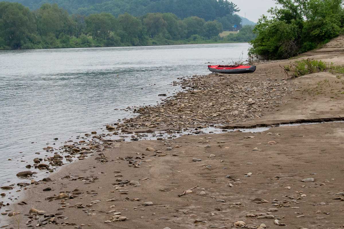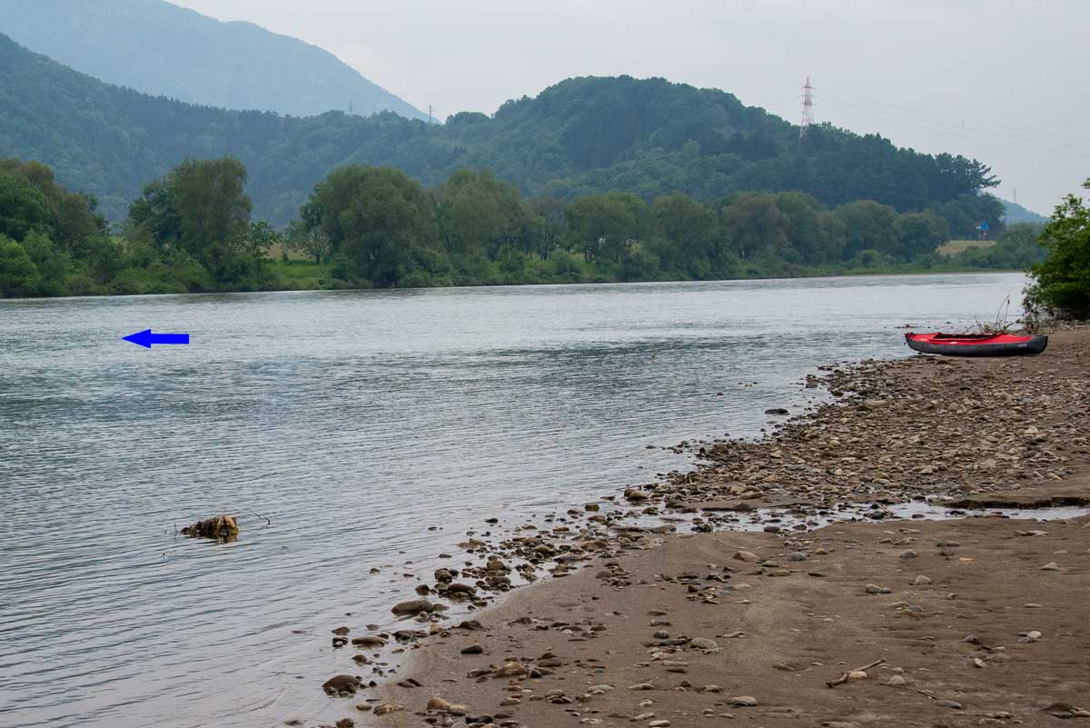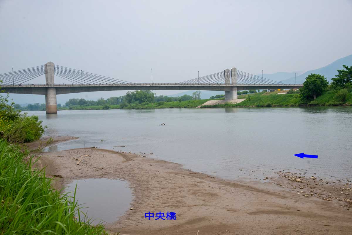 飯山にある中央橋を横から眺めるため、左岸土提から川面に下りたら、カヌーのために静岡から訪れた人と出会った。
