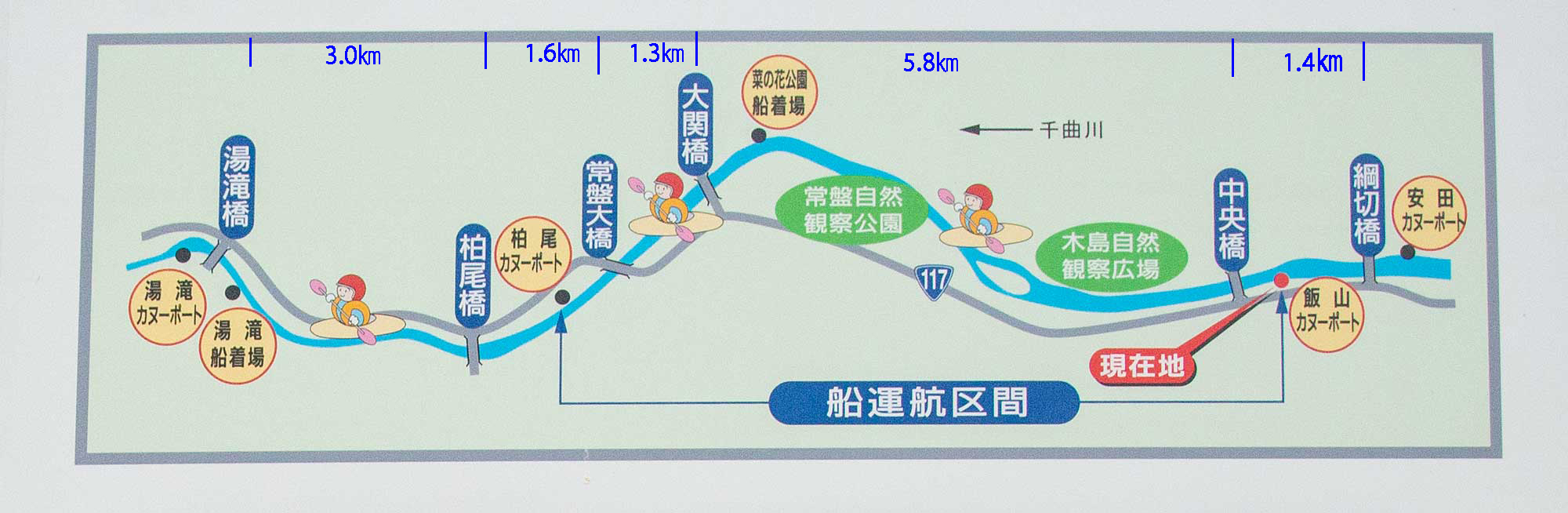 | 飯山のカヌーポートは千曲川に架かる綱切橋からおよそ13km下流の湯滝橋までにある なお、橋間の距離は地理院地形図から測定したのでおおよその距離 |